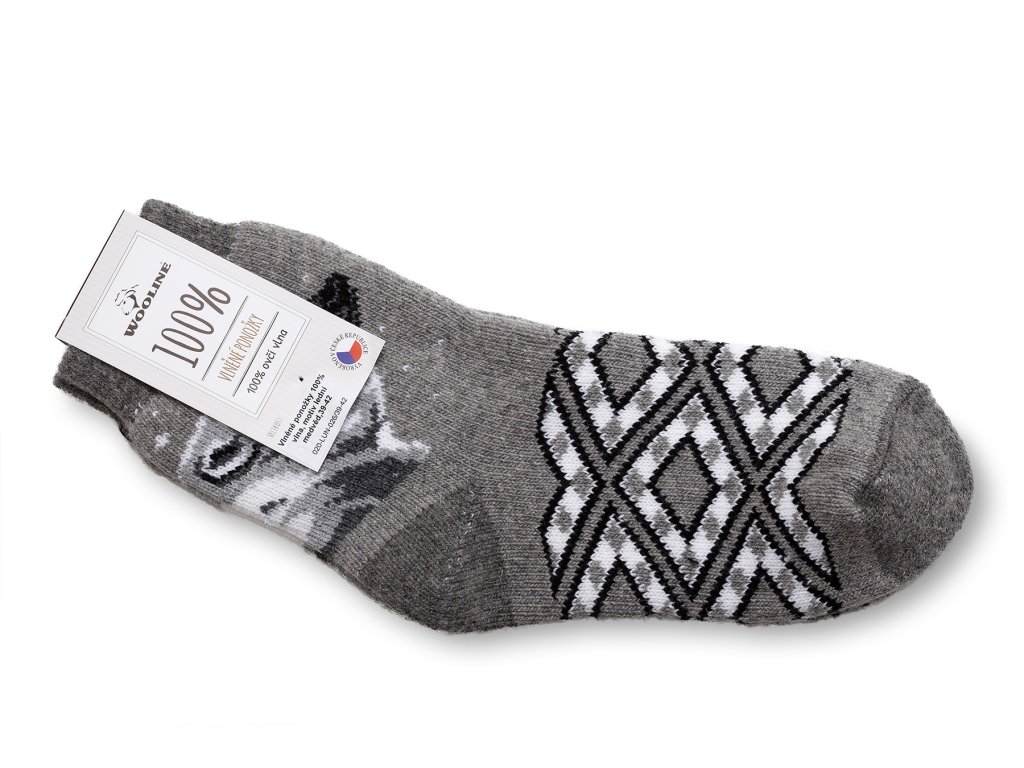 A sötétbarna gyapjú zokni jegesmedve motívummal van ellátva. A zokni puha tapintású, a gyapjúszál erős, és a zokni használat közben is megtartja alakját. A zoknikat géppel kötik. A zokni a vádli területén szűkített szegéllyel rendelkezik, aminek köszönhetően nem csúszik lefelé.