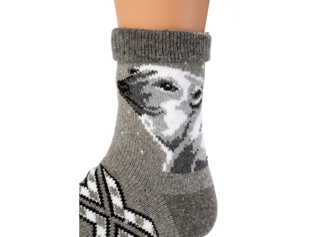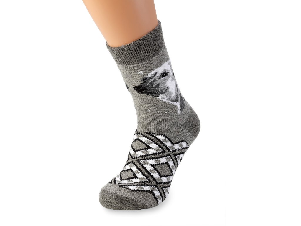 Anyag: 100% európai merinó, Alkalmas: hölgyeknek és férfiaknak Méret: 36 - 45, Szín: szürke alap sötétszürke motívummal, jegesmedve motívum világos és világosszürke színben
