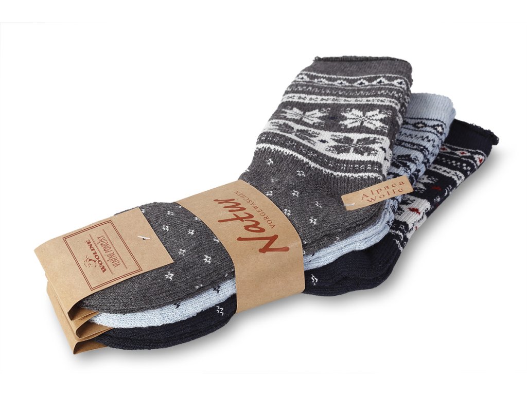 A Wooline Natur meleg gyapjú zokni szett nagyon puha és lágy gyapjúból készült. A láma alpaka gyapjú zokni szett 3 pár különféle mintás zoknit tartalmaz. A minták megfelelnek a képen láthatóknak. A felhasznált anyagnak köszönhetően a zokni alkalmazkodik a lábfej méretéhez.