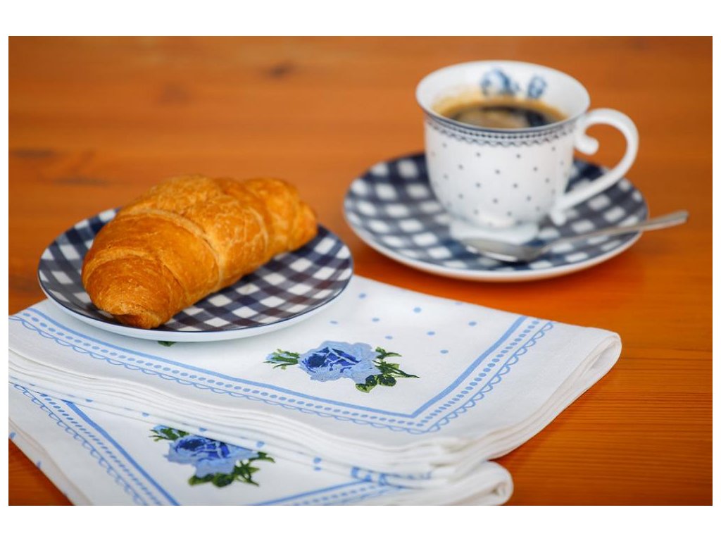 A pamut teakendők fehér alapon kék színű, aranyos kis rózsák motívumával készülnek. Ennek a színkombinációnak köszönhetően a konyharuha motívuma friss, tavaszias benyomást kelt. A pamut konyharuhák két oldalán szegély van. Az anyag nagyon kellemes és nedvszívó, amit mindenki értékelni fog a háztartásban.