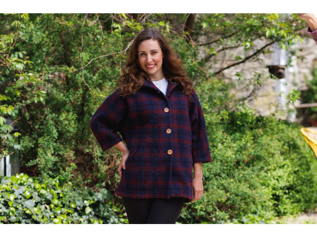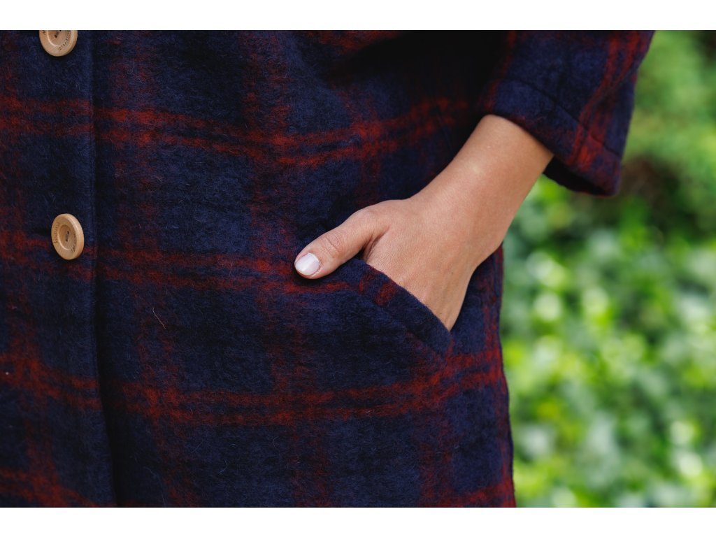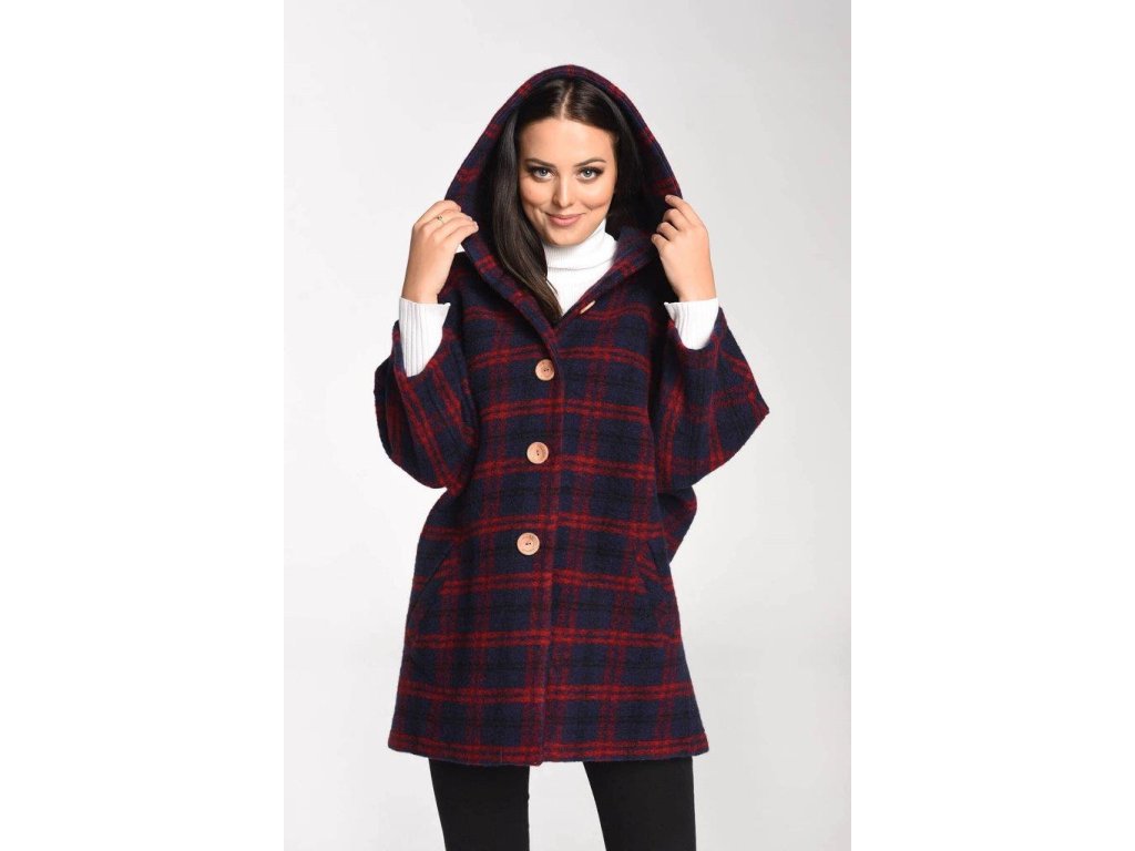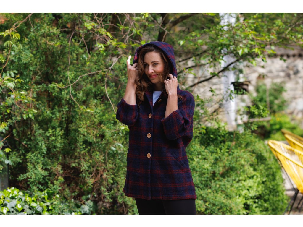 Anyag: 100% európai merinó, Méret: univerzális - egységes méret, Szín: kék, piros motívumos négyzetek, Kapucni: IGEN, Zsebek: IGEN, Zárás: kerek fa gombok; Mintázat: kockás, Szezon: egész évben