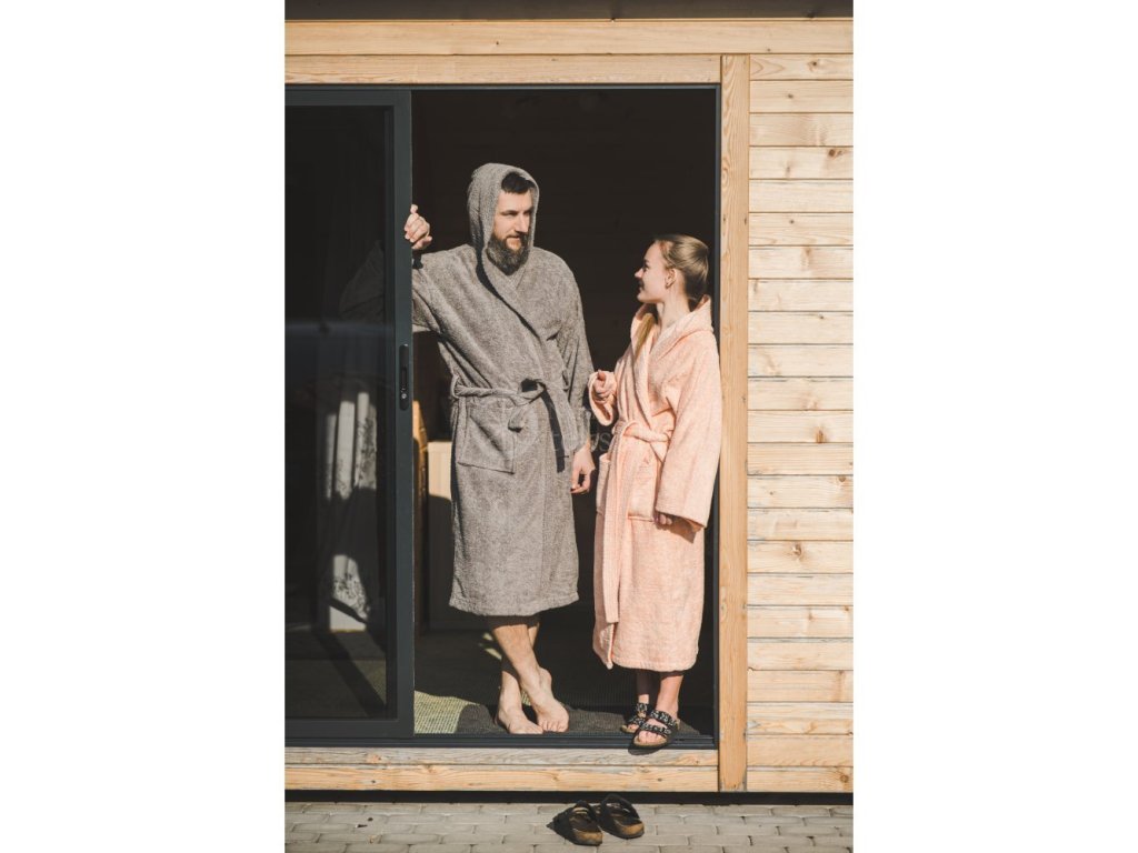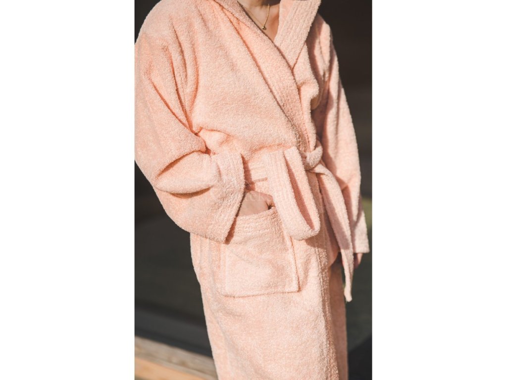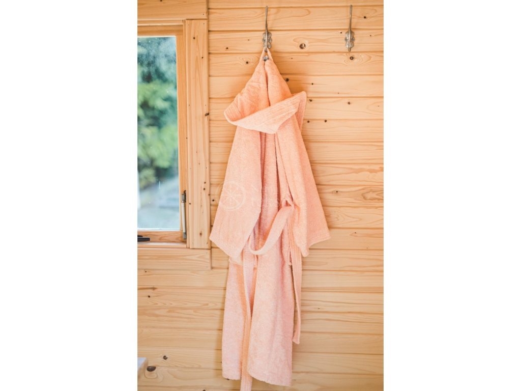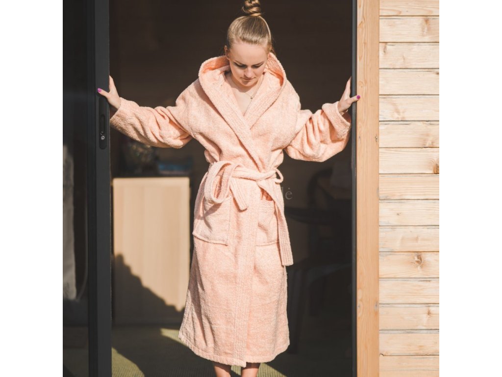 A női frottír szauna köntös puha 100% pamutból készült, világos őszibarack színben. Ez a szauna köntös nagyon puha, finom és bolyhos tapintású.