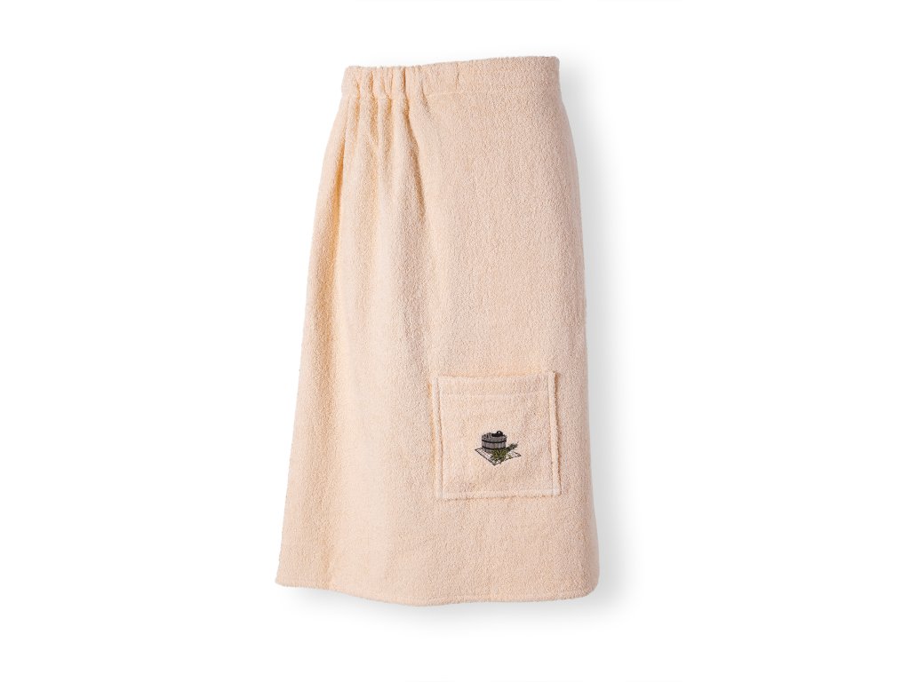 A frottír pamut anyag nagyon puha és kellemes tapintású. Tökéletesen befedi a testet és felszívja a felesleges nedvességet. A használatának előnye, hogy például a szaunába érve kinyithatja a ruhát, és szaunapadon alátétként használhatja, és ráülhet. A szaunaruhát intenzív hőségben való használatra tervezték. A kiváló minőségű szaunaruha egy praktikus zsebbel is fel van szerelve, ahová elrejtheti a magánál tartani kívánt értéktárgyakat vagy a kulcsot. A zseb a szaunaruha alján elöl található, és egy vödör hímzéssel díszített.