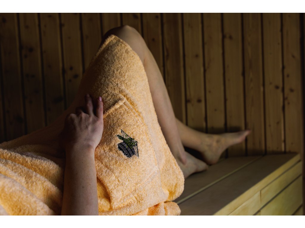 Anyag: 100% pamut, Szín: barack, Méret: 75 x 150 cm, Alkalmas: nőknek, Felhasználás: szauna kiegészítők, Rögzítés: tépőzáras