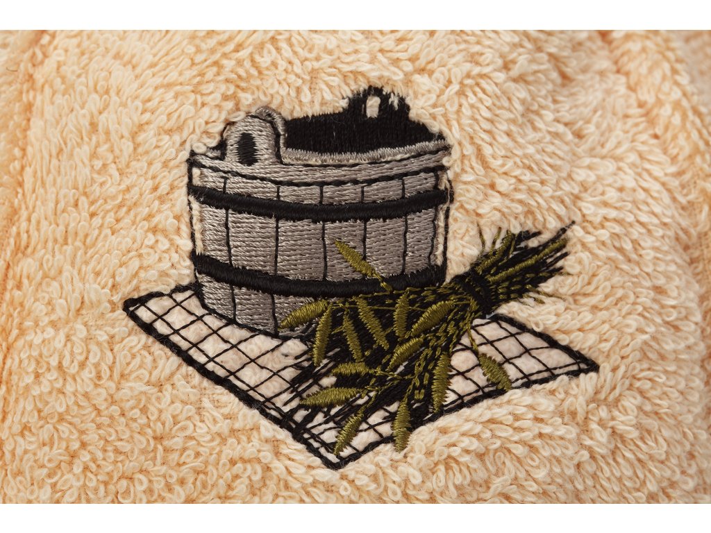 A szauna sapka anyaga 100% frottír pamut, amely nagyon puha és kellemes tapintású. A szaunasapkákat szaunában való használatra tervezték a fej túlmelegedése ellen. És ez a fő funkciójuk. A felhasznált anyag erősebbé, ellenállóbbá és tartósabbá teszi a sapkát. A szaunasapka lágy barackszínű, elöl hímzett vödör szimbólummal.