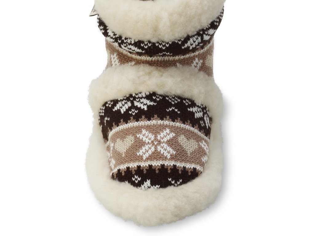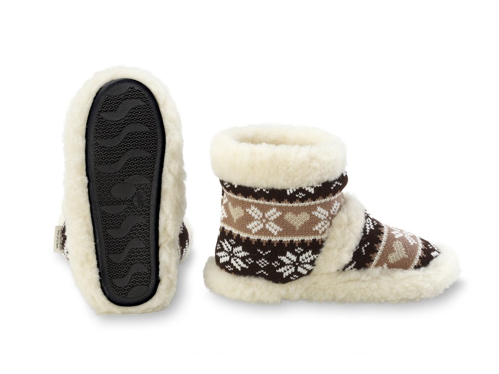 Ez a modell világos- és sötétbarna motívumokkal, világos hópehely mintával kombinált kivitelben kapható. A házi papucs alkalmas anyukáknak, apukáknak, nagymamáknak és nagypapáknak is.
