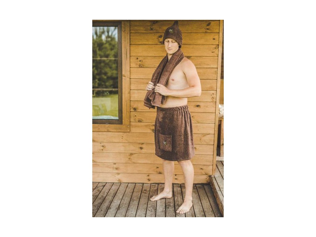 A férfi szauna kiltet a deréktól a térdig betűrve hordják. Elöl tépőzárral rögzíthető.