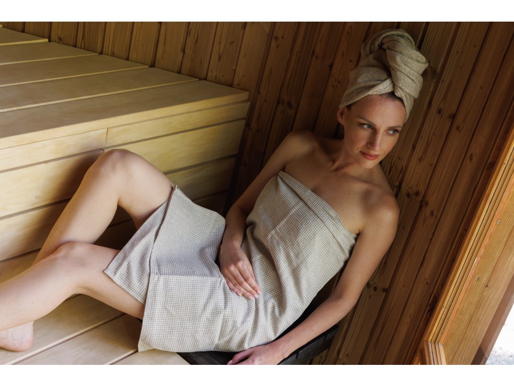 A puha szaunatörülköző vászonból és pamutból készült. A vászontörülközők puhább tapintásúak, mint a hagyományos vászon, és könnyebbek, mint a hagyományos frottírtörülközők. A szauna törölköző nagyon jól felszívja a nedvességet, és nagyon kényelmes a test számára.