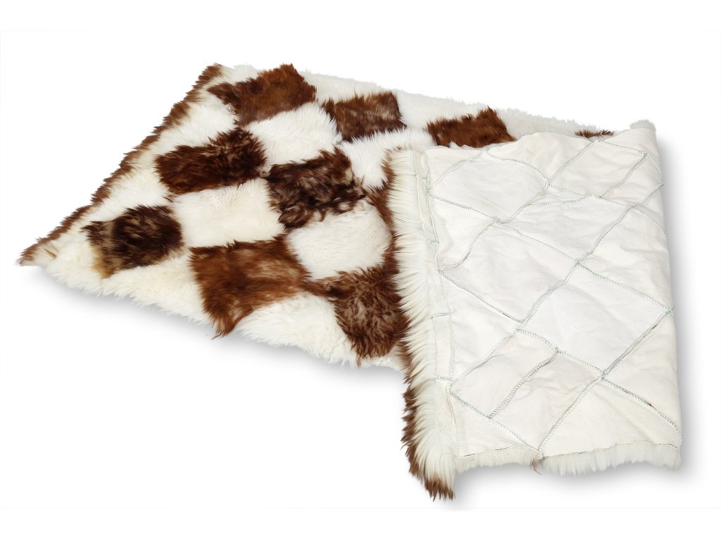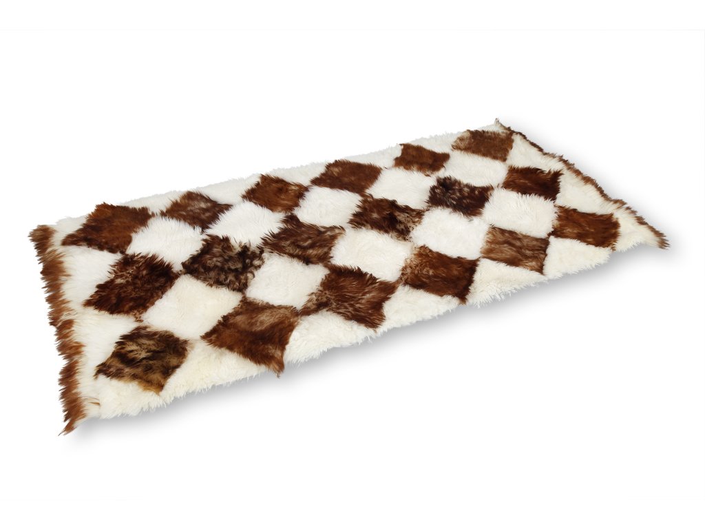 Anyag: kb. 20 x 20 cm-es, barna és fehér színű báránybőrből készült, rombusz alakú négyzetek, amelyek össze vannak varrva, hogy padlószőnyeget alkossanak; Méret: 80 cm x 175 cm