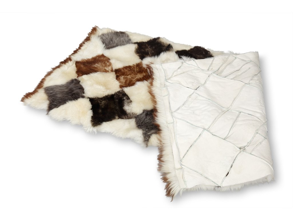 Anyag: barna, fekete és fehér színű báránybőrből készült, kb. 20 x 20 cm-es, rombusz alakú négyzetek, amelyek egymáshoz varrva szőnyeget alkotnak a padlón; Méret: 80 cm x 175 cm