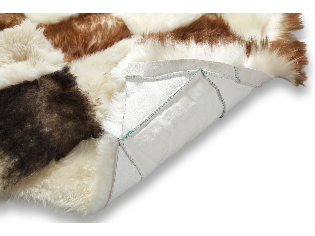 Természetes, 80 x 175 cm méretű dekoratív szőnyeg. A szőnyeg egyenlő méretű, körülbelül 20 x 20 cm-es rombuszok összevarrásával készült. A szőnyeg egyedi kialakításának köszönhetően nagyon különleges. A bőrdarabokat kézzel varrják össze, ennek köszönhetően a szőnyeg nagyon precízen készül, és minden egyes darab eredeti. A szőnyeg rövidebb oldalait ugyanezzel a birkaszőr mintával díszítik, hogy az egésznek egységes megjelenést kölcsönözzenek.