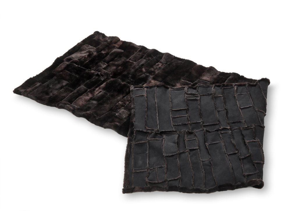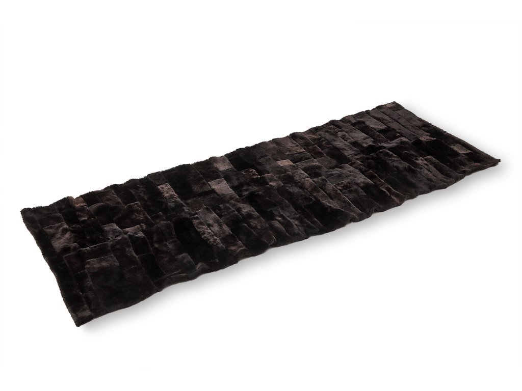 Anyag: birkabőrök darabok összeforrasztva; Szín: sötétbarna; Méret: 160 cm x 60 cm; Súly: 2,5 kg