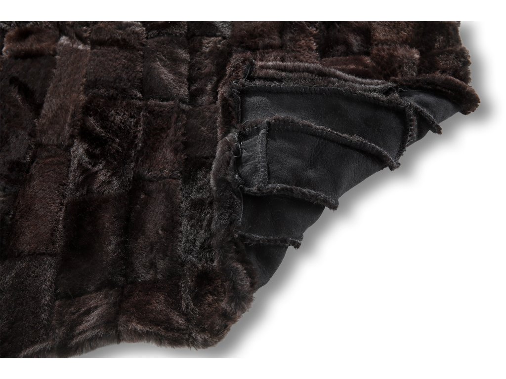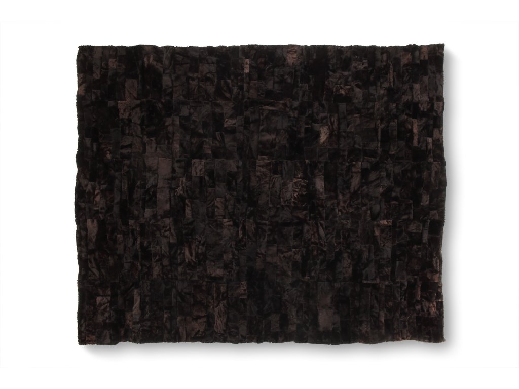 Természetes dekoratív szőnyeg, amelyet különböző méretű, sötétbarna színű birkabőr téglalapok összevarrásával hoztak létre. Ez a sima birkabőr szőnyeg 200 x 220 cm-es méretben kapható. Elhelyezése alkalmas nagy reprezentatív terek díszítésére is. A dizájnos szőnyeg nagyon puha és finom tapintású. Bármilyen nyitott térben kitűnik.