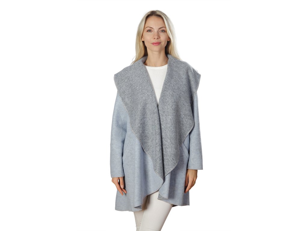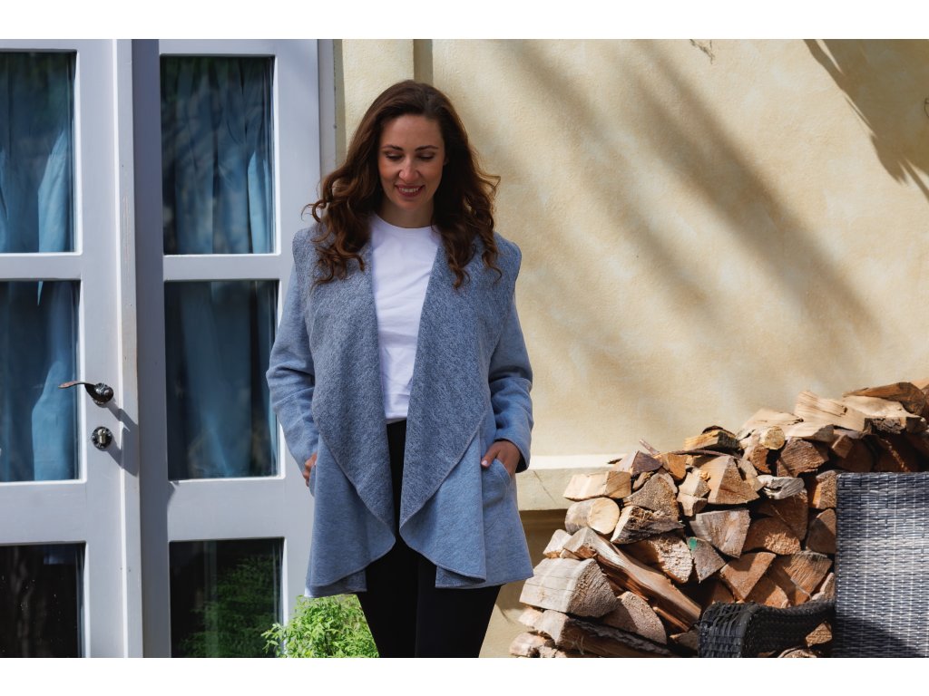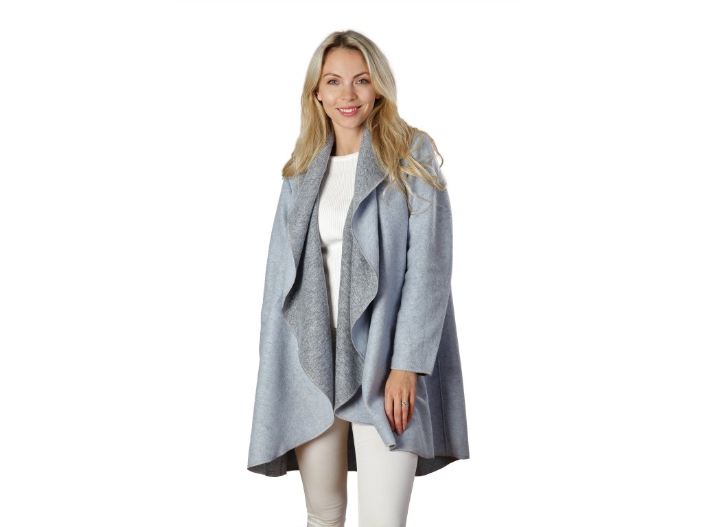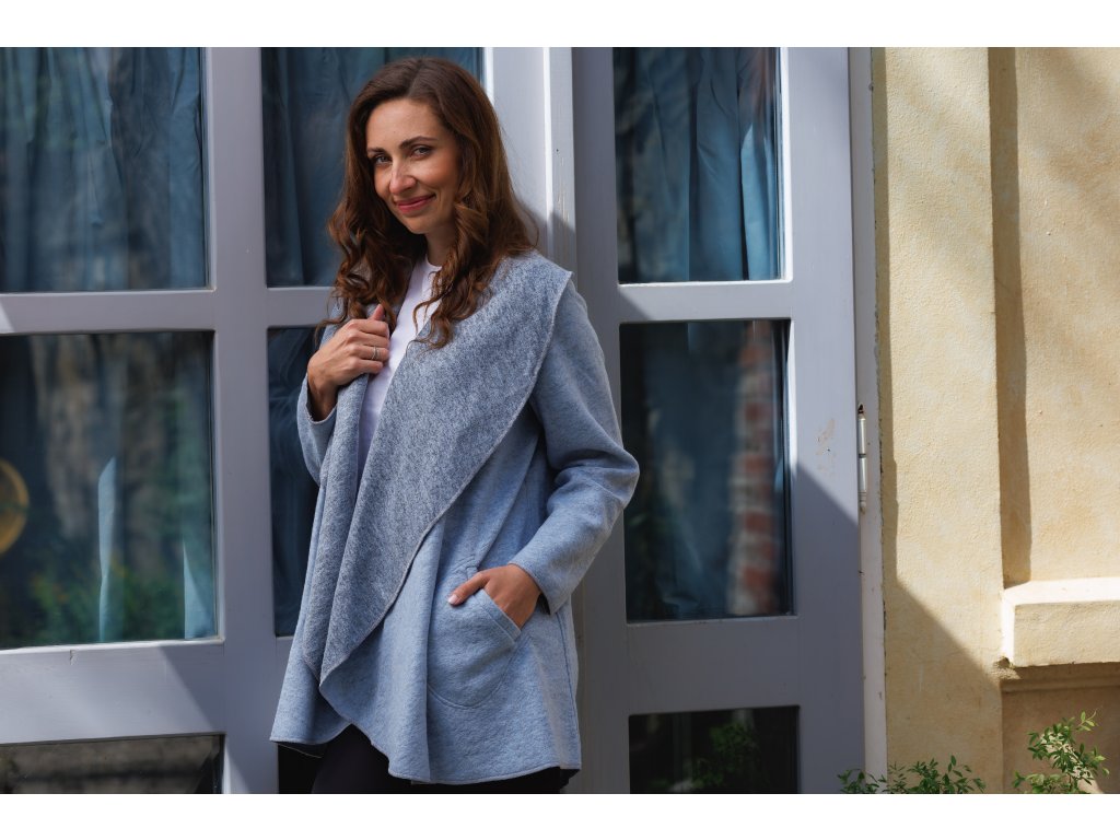 A Bluebell nevű modern gyapjúkabát 100% juhgyapjúból készült. A kabát nagyon könnyű viselet, de a választott anyagnak köszönhetően kellemesen meleg. A kabát laza, áramló szabású. A hajtókán nincs rögzítés vagy tépőzár. A kabátnak hosszú ujjai és mindkét oldalán zsebek vannak, amelyeket a hidegebb évszakban biztosan használni fogsz.