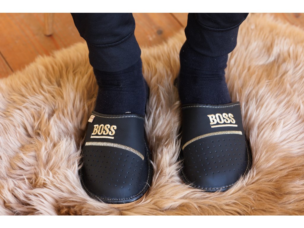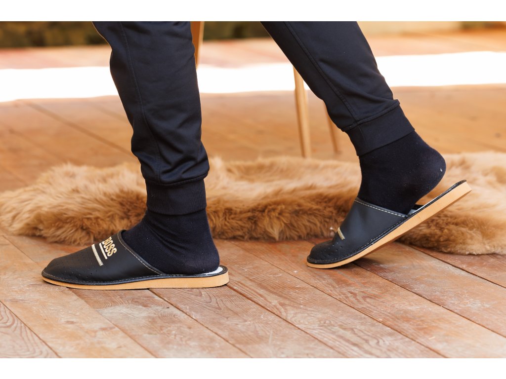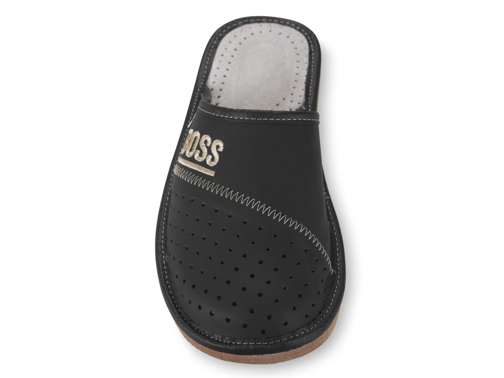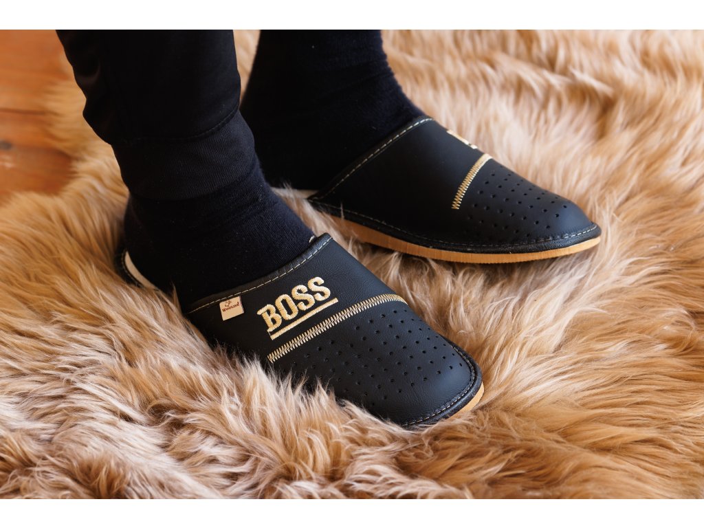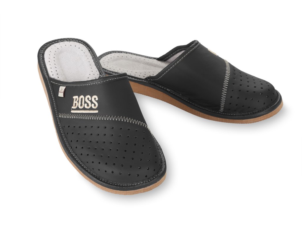 A bőr férfi papucs felső része   sötét bőrből készült. A sötét rész BOSS feliratú hímzéssel díszített. A papucs fekete része perforált, így a papucs jobban szellőzik. A belső rész bőrből készült részt tartalmaz, amellyel a lábfej és a boka területe van bevonva. A férfi bőr papucs talpa csúszásmentes szintetikus anyagból készült.
