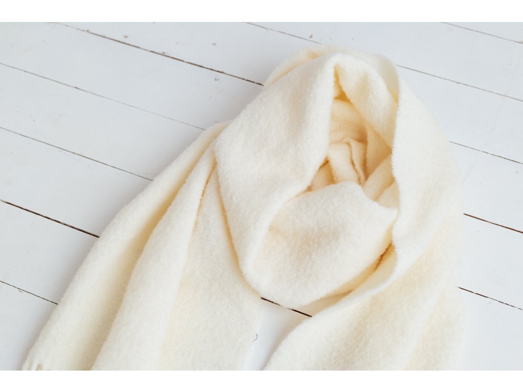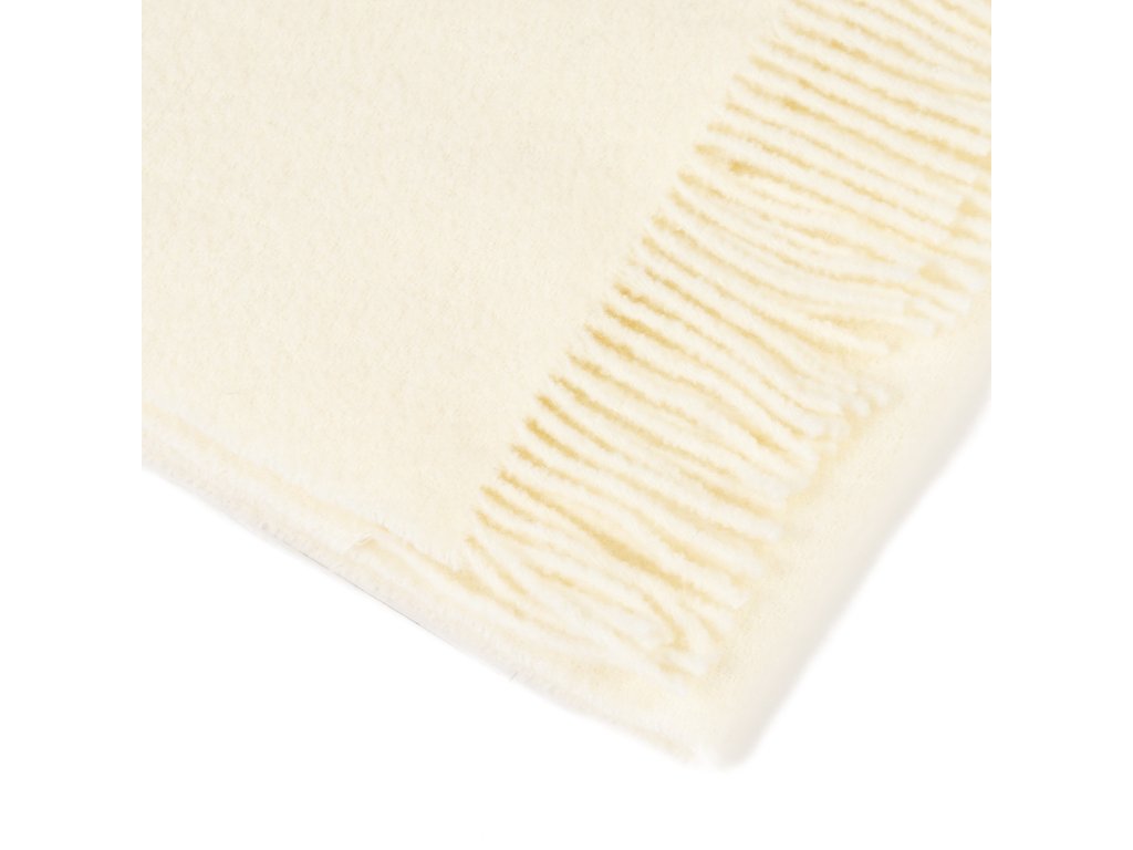 A BOUCLE gyapjú sál világos krémszínű rojtokkal nagyon finom ausztrál merinói gyapjúból készült, amelyet poliészter szálakkal dúsítottak.