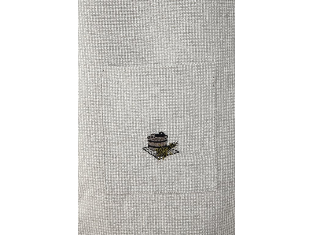 A különböző méretű négyzetek a felületén, amelyek darázsmintát szimulálnak, elegánsabbá teszik a szaunaruhát. Ugyanakkora területű anyag több nedvességet képes magába szívni, mint egy sima textil. A darázsmintás szaunaruha puhább, mint a sima anyag, finomabb és kényelmesebb a test számára. A szaunaruhát intenzív hőségben való használatra tervezték. A kiváló minőségű, férfiaknak való szauna kilt egy praktikus zsebbel is fel van szerelve, ahová elrejtheti a magánál tartani kívánt értéktárgyakat vagy a kulcsot. A zseb a szaunaruha alján elöl található, és egy vödör hímzéssel díszített.