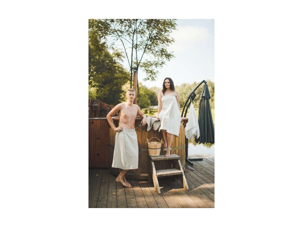 A férfi szauna kiltet a deréktól a térdig betűrve hordják. Elöl tépőzárral rögzíthető.