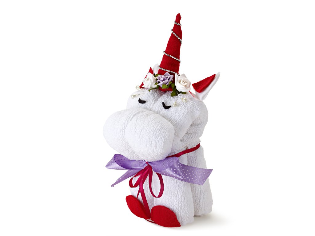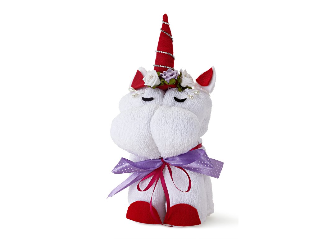 Alvó egyszarvú alakú frottír törölközőből készült és minden korosztály számára alkalmas. Nagyon népszerű a gyerekek körében, és gyakran előfordul, hogy végül a törölközőt ki sem csomagolják és nem használják.