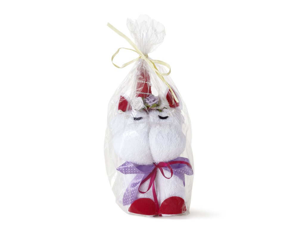 Eredeti és egyedi módon összehajtogatott törölköző egy alvó egyszarvú formájában, gyönyörű piros szarvval. Az egyszarvú a következőkből áll 1 darab fehér színű,500g/m2súlyú frottírtörülközőből a mérete 50 x 100 cm. A szemek, a fülek és a lábak filcből készültek, és könnyen levehetők. A nyakát egy jellegzetes lila pöttyös masni díszíti. A sarok ezüst gyöngyös szegéllyel van beszegve. Minden díszítőelemet egy tűvel rögzítenek a törölközőhöz, és könnyen eltávolítható, a törölköző pedig a szokásos módon használható.