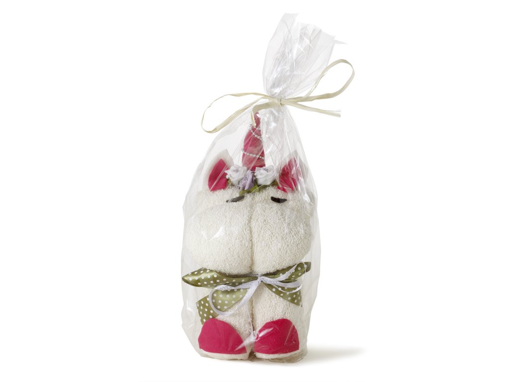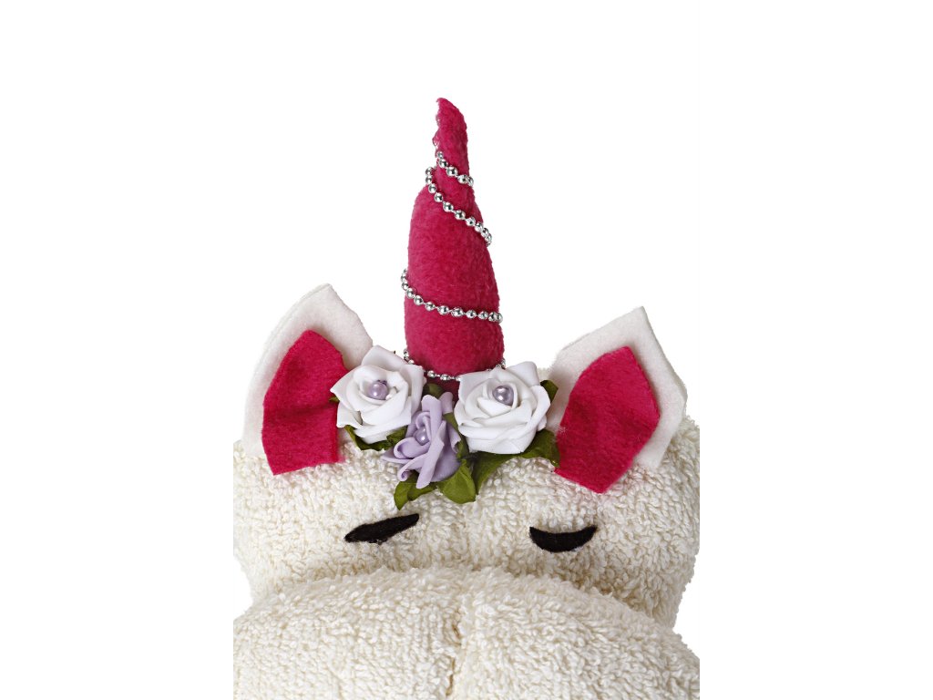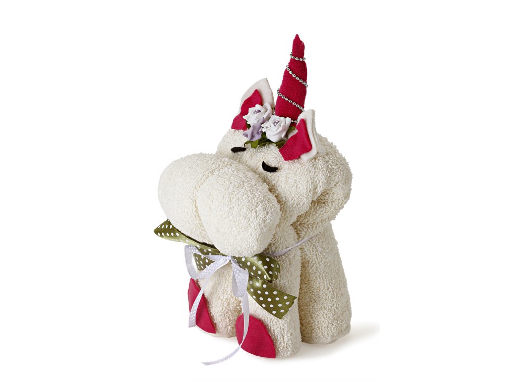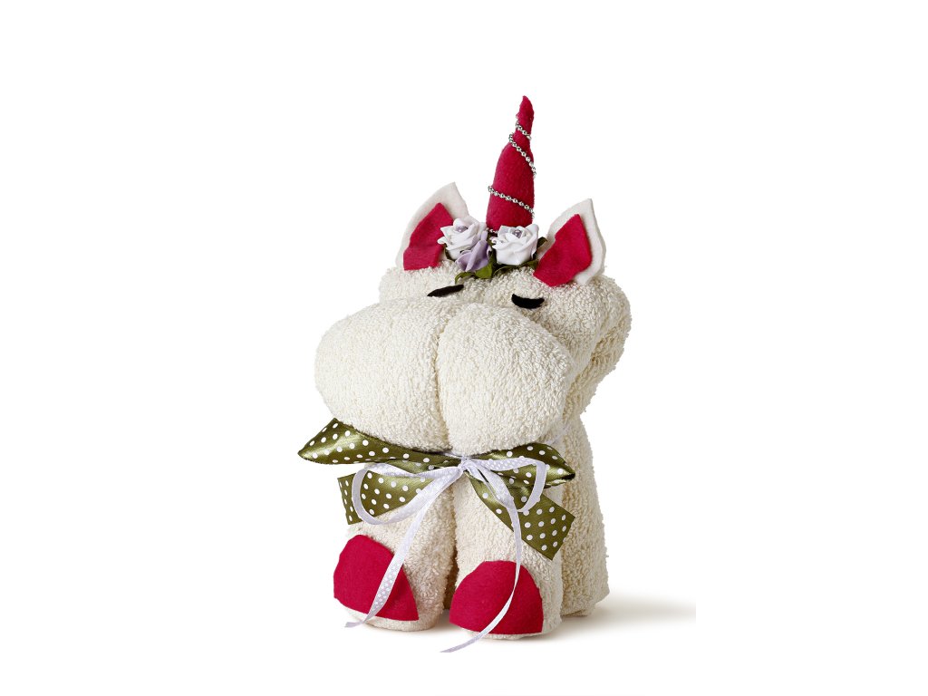 Alvó egyszarvú alakú frottír törölközőből készült és minden korosztály számára alkalmas. Nagyon népszerű a gyerekek körében, és gyakran előfordul, hogy végül a törölközőt ki sem csomagolják és nem használják.