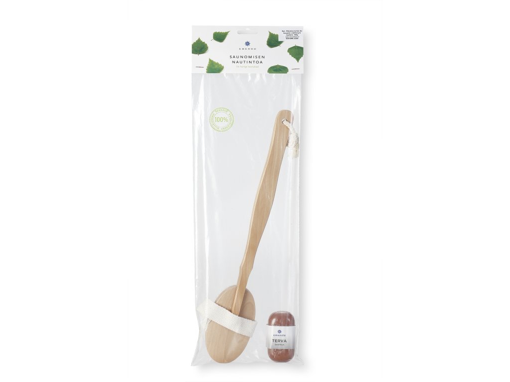 A természetes sörtékből készült, fa masszázskefe a test „száraz kefélésére” szolgál a szaunába lépés előtt. A nyél végén található praktikus zsinór a kefe praktikus felakasztására szolgál. A csomagban 100 g kátrányszappan található.