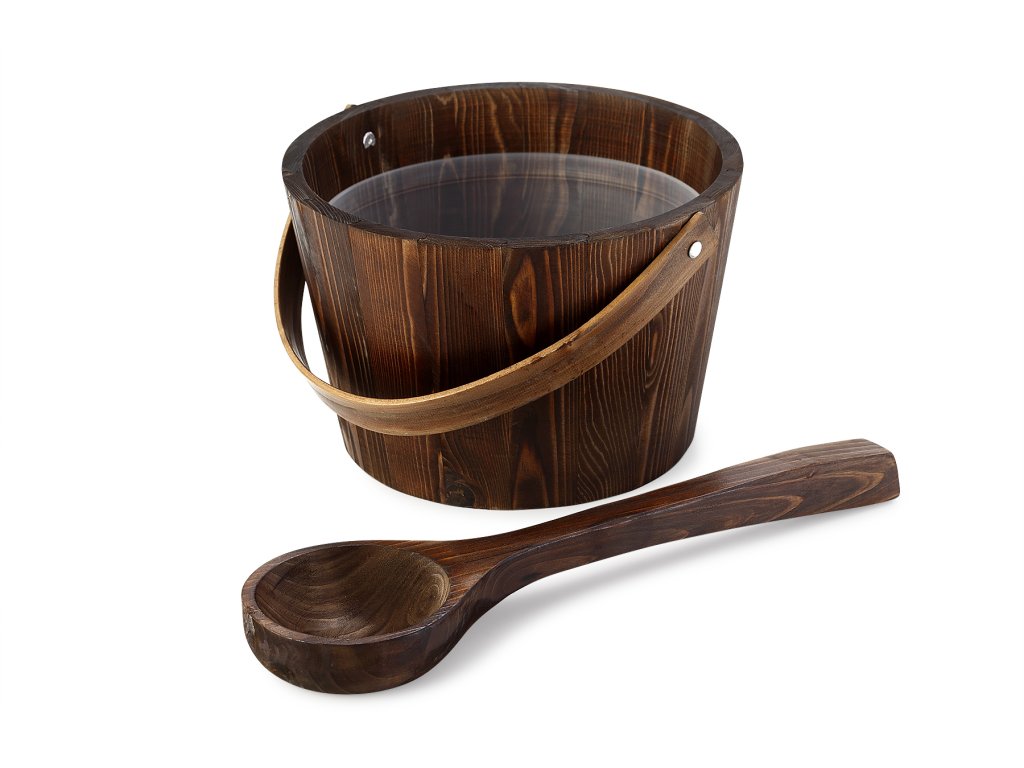 A vödör és betét szett tartalmaz egy stílusos, fából készült szaunakanalat.