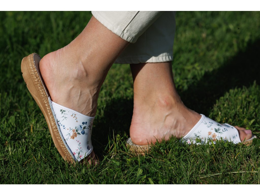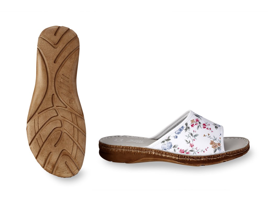 A női bőr papucs különösen a tavaszi és nyári szezonra alkalmas. A női szandál külső felülete valódi marhabőrből készült fehér színben színes virágmintával. A bőr külső felülete laminált. Ez azt jelenti, hogy a bőrt olyan anyaggal vonják be, amely nem engedi át a vizet. Ezenkívül a lábbeli felsőrészét keményítőszerben áztatják, hogy a papucs a lábfej környékén megmerevedjen. Ez a felületkezelés biztosítja a lábbeli stabil alakját, a cipő nem deformálódik használat közben, és pontosan illeszkedik a lábfejhez. A papucs felsőrészét erős cérnával varrják a belső profilozott talpbetéthez. A szandál orra nyitott.