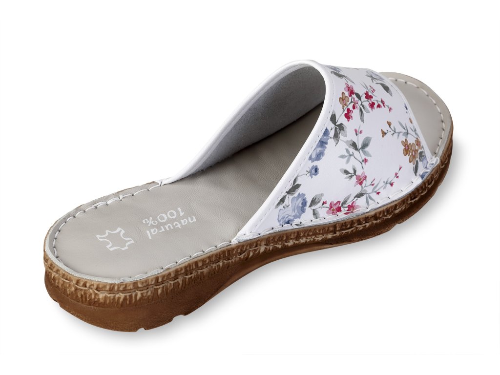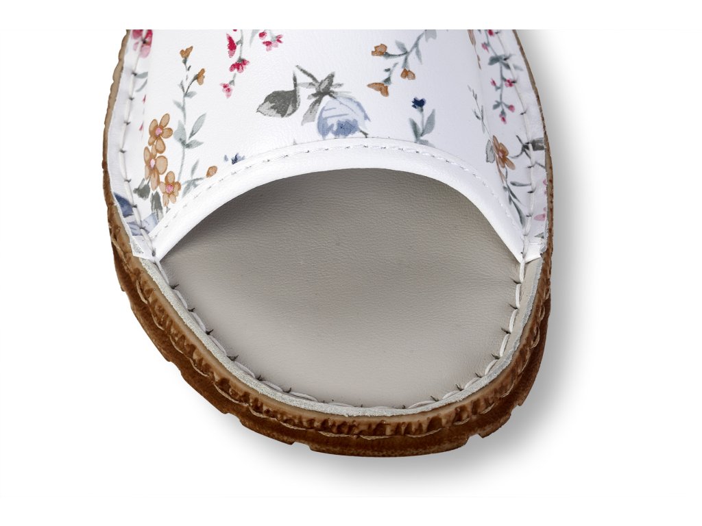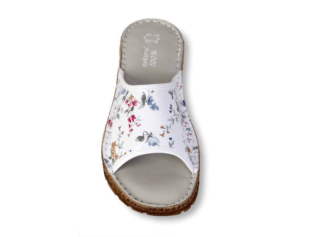 A fehér színű női bőr papucs színes virágmintával van díszítve és beltéri használatra készült. A bőr papucs belebújós típusú, elöl nyitott. A papucs gyártásához marhabőrt használtak, amely megtartja az alakját, és ennek köszönhetően a lábbeli nem deformálódik viselés közben.