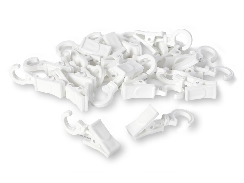 Fehér forgatható műanyag függönycsipeszek akasztóval 28 mm átmérőjű függönytartóra alkalmas karikákhoz
