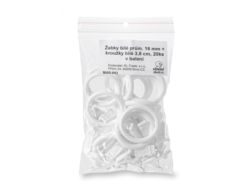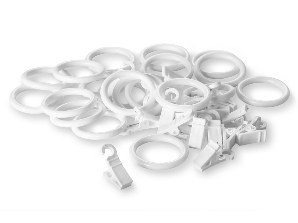 Műanyag szandál és műanyag gyűrűk készlete fehér színben. A karika 16 vagy 19 mm átmérőjű függönytartó rúdra való felhúzásra szolgál. A karikák rúdra való felhúzása után már csak a függönyt kell felakasztania a fém függönycsipeszekre.