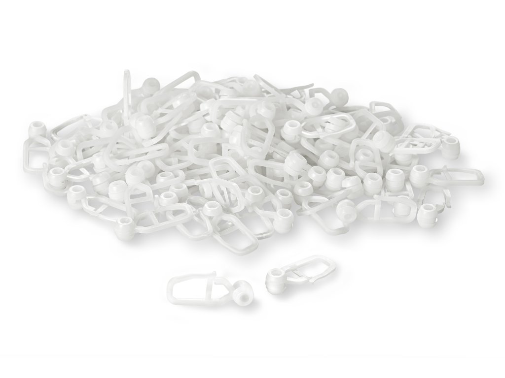 A függönyökhöz és függönyrudakhoz való fehér műanyag kampó a sínbe csúsztatható csúszkával van felszerelve. A csúszkával ellátott kampó nagyszerű futási tulajdonságokkal rendelkezik, amelyek lehetővé teszik a függöny vagy drapéria könnyű kezelését. A kampó egy szalagra van felfűzve, zárható, és ennek köszönhetően a függönnyel együtt mosható a mosógépben.