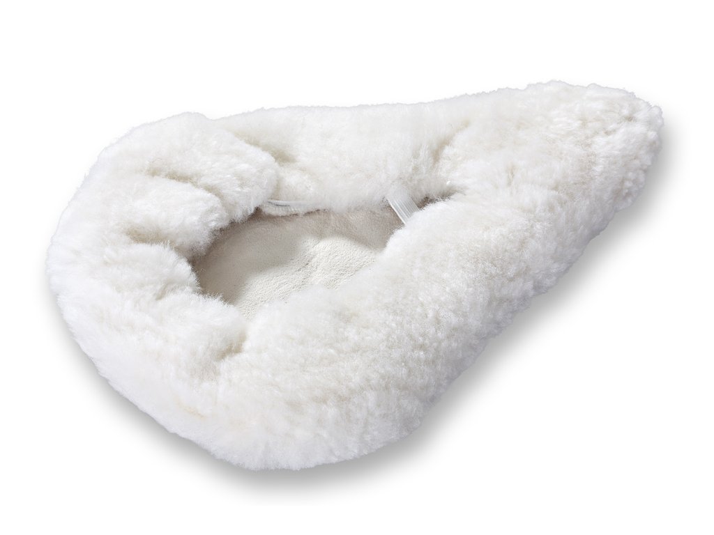 Anyag: természetes báránybőr, elasztikus, Szín: fehér, Méret: kerékpárra alkalmas, Kialakítás: allergiásoknak alkalmas szőrme