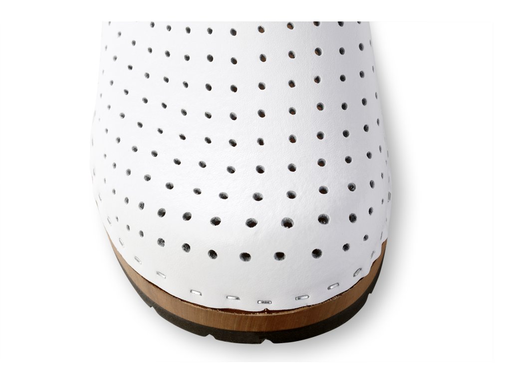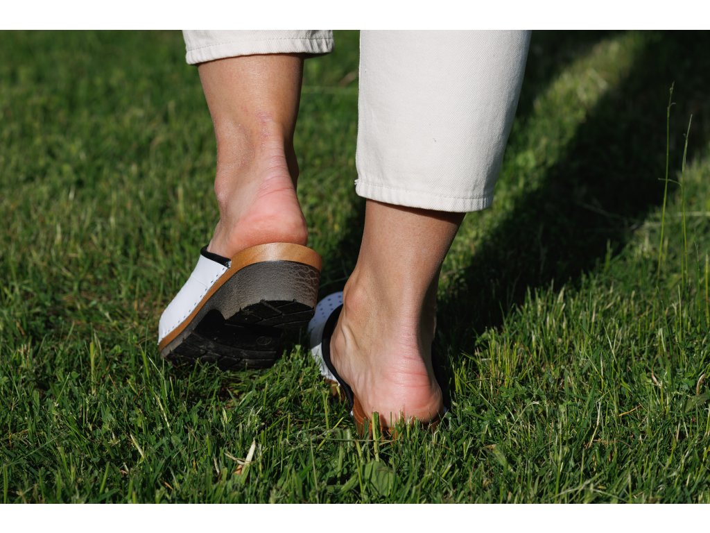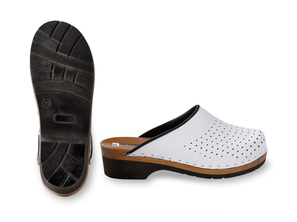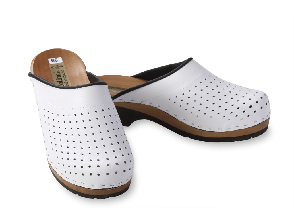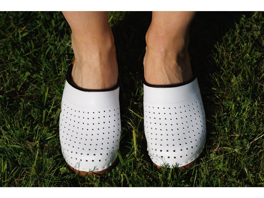 Éktalpú ortopéd klumpa fehér felsőrésszel és fekete szegéllyel. A cipő felsőrésze marhabőrből készült, a felület perforált a jobb szellőzés érdekében. A talp gyártásához fa és vastag rétegű csúszásgátló mikrogumi kombinációját választották.