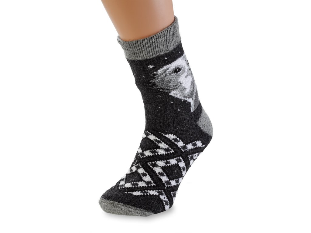 Anyag: 100% európai merinó, Alkalmas: hölgyeknek és férfiaknak Méret: 36 - 45, Szín: szürke alap fekete motívummal, jegesmedve motívum világos és világosszürke színben
