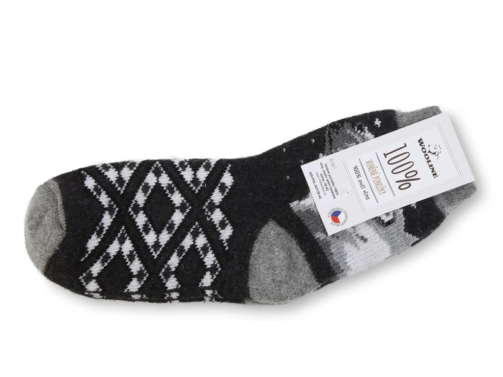 A sötét gyapjú zokni jegesmedve motívummal van ellátva. A zokni puha tapintású, a gyapjúszál erős, és a zokni használat közben is megtartja alakját. A zoknikat géppel kötik. A zokni a vádli területén szűkített szegéllyel rendelkezik, aminek köszönhetően nem csúszik lefelé.