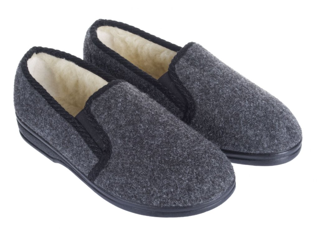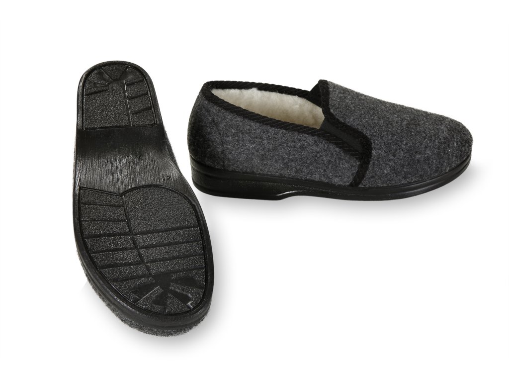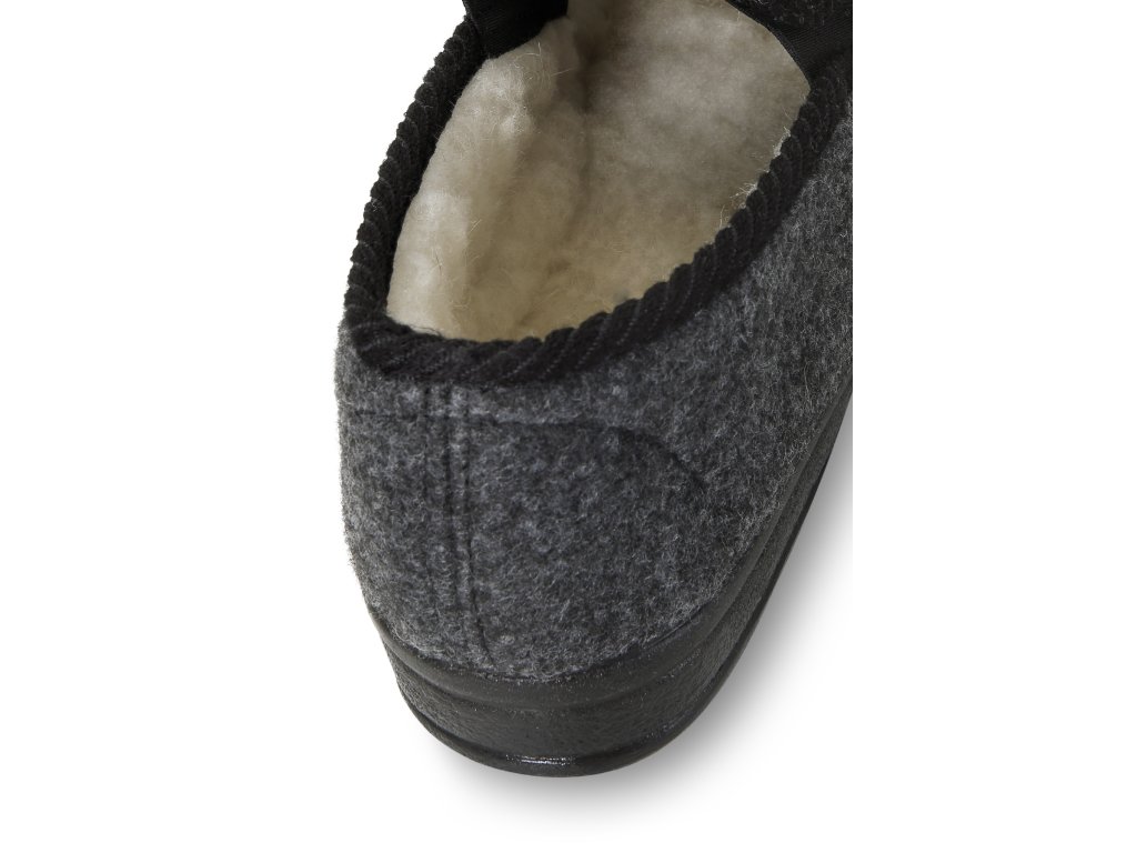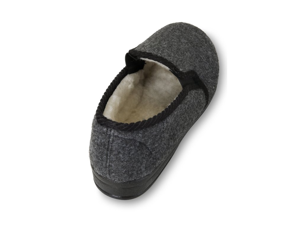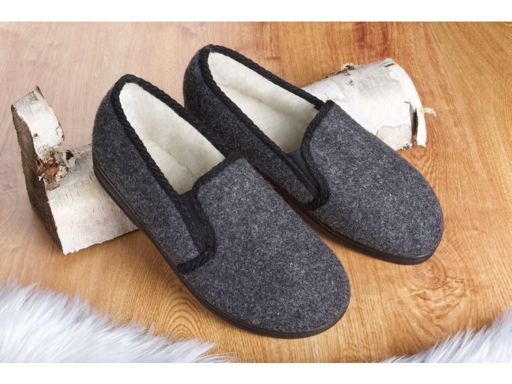 A papucs sarka zárt, a belső bélés meleg birkagyapjúból készült. Az idősebbek igényeihez igazodik, a lábfej magassága két gumipánt segítségével állítható. A házi papucs idősek számára készült, akik értékelik a melegségét és kényelmét. Az alja könnyű és rugalmas PU anyagból készült.