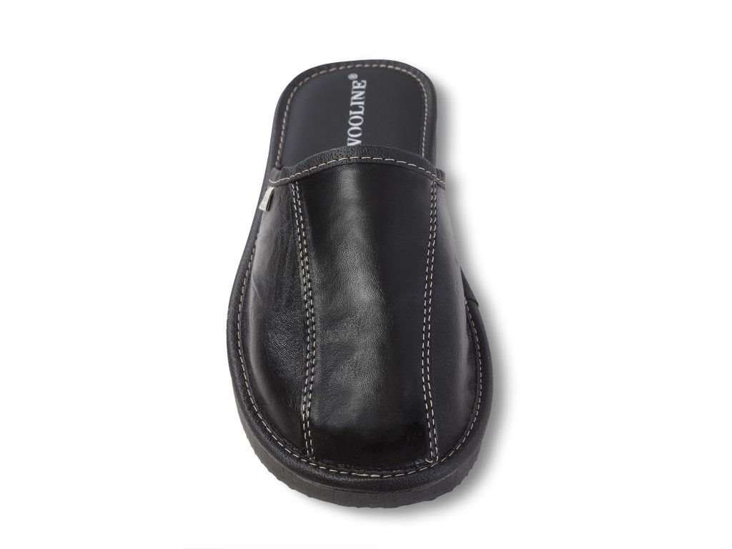 A bőr férfi papucs felsőrésze elegáns, sima fekete bőrből készült. A papucs teteje varrott. A bőr férfi papucs talpa csúszásmentes szintetikus anyagból készült. A klasszikus fekete bőr férfi papucs időtálló modell minden férfi számára, mivel nagyon kényelmes és nyugodt benne a járás.