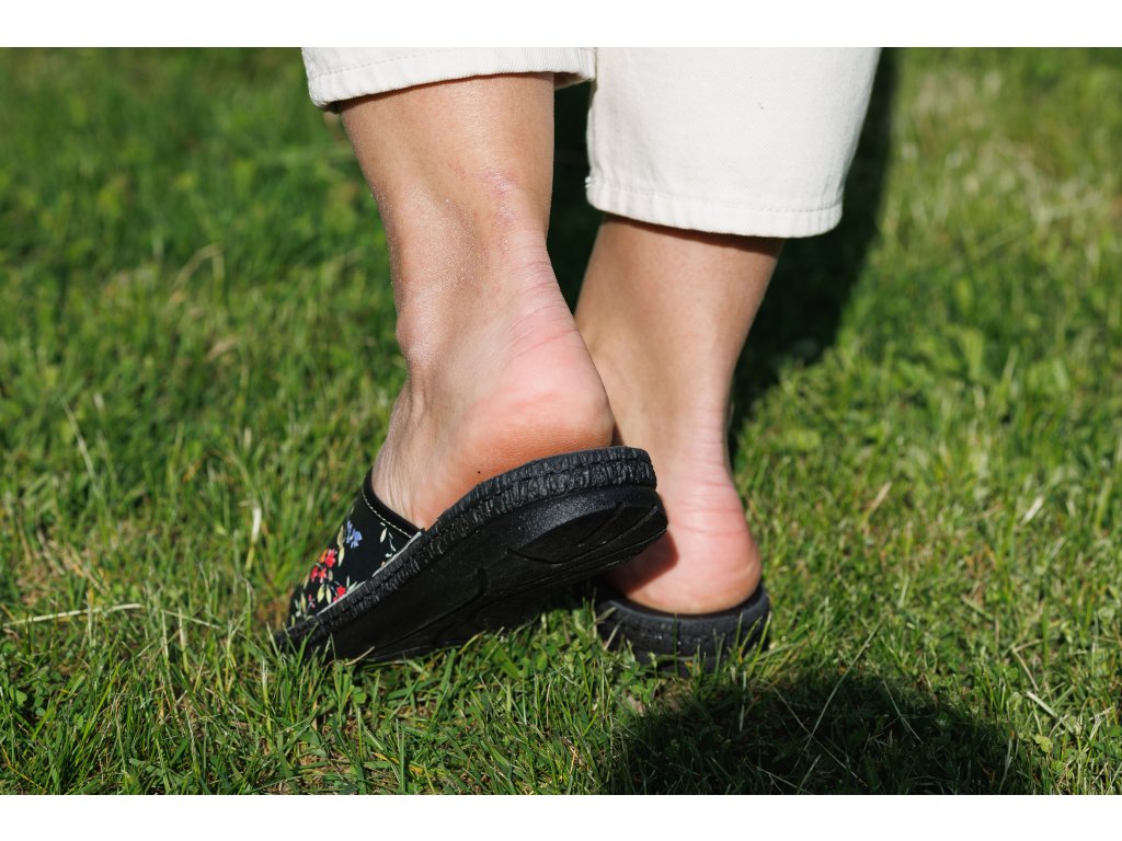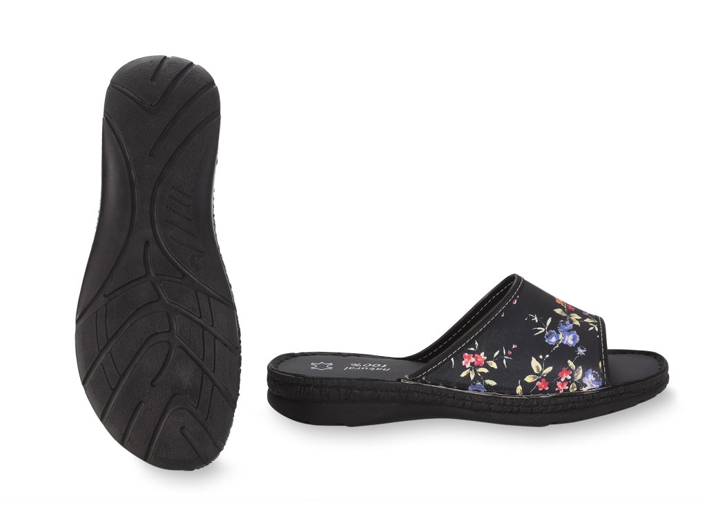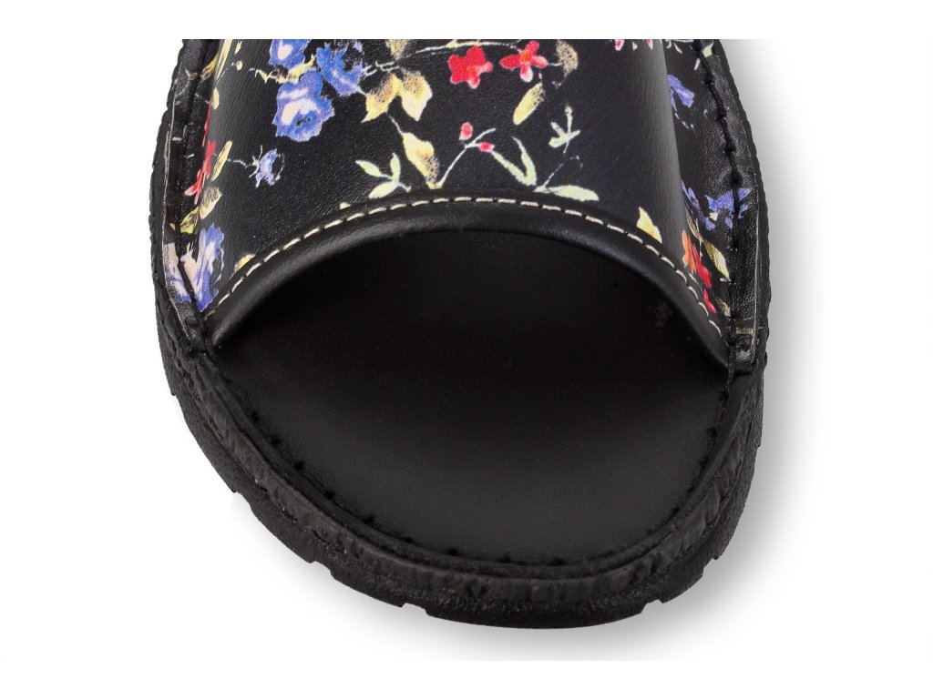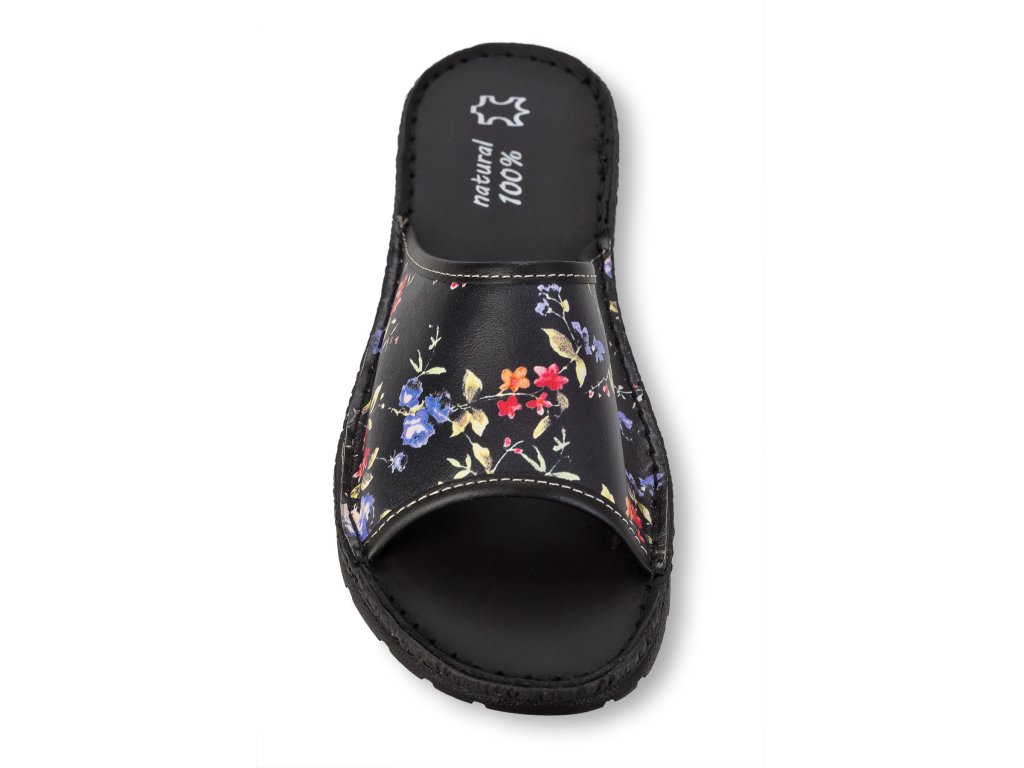 A fekete színű női bőr papucs színes virágmintával van díszítve és beltéri használatra készült. A bőr papucs kivételes kialakítású. A papucs belebújós típusú, elöl nyitott. A papucs gyártásához marhabőrt használtak, amely megtartja az alakját, és ennek köszönhetően a lábbeli nem deformálódik viselés közben.