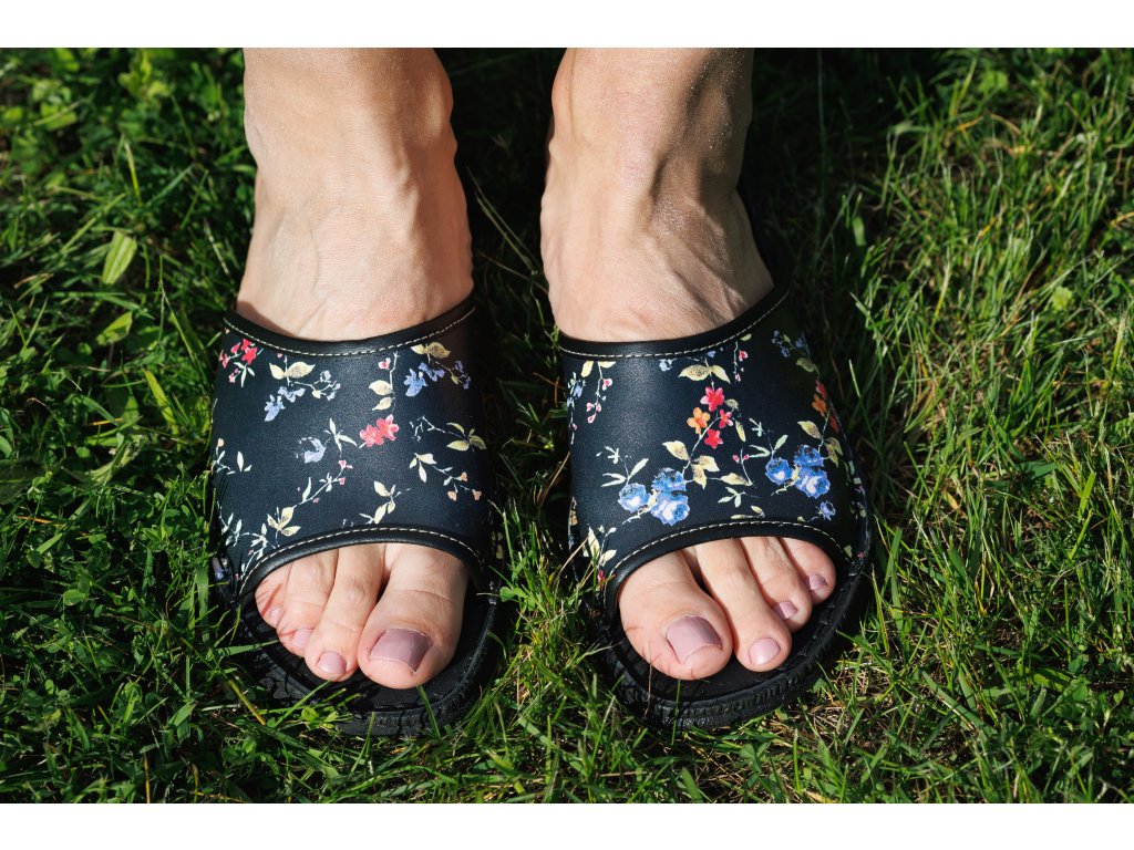 A női bőr papucs különösen a tavaszi és nyári szezonra alkalmas. A női szandál külső felülete valódi marhabőrből készült fekete színben, élénk színes virágmintával. A bőr külső felülete laminált. Ez azt jelenti, hogy a bőrt olyan anyaggal vonják be, amely nem engedi át a vizet. Ezenkívül a lábbeli felsőrészét keményítőszerben áztatják, hogy a papucs a lábfej környékén megmerevedjen. Ez a felületkezelés biztosítja a lábbeli stabil alakját, a cipő nem deformálódik használat közben, és pontosan illeszkedik a lábfejhez. A papucs felsőrészét erős cérnával varrják a belső profilozott talpbetéthez. A szandál orra nyitott.