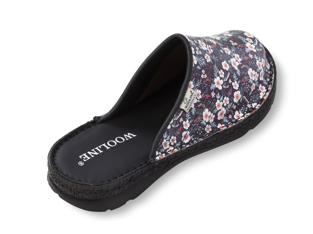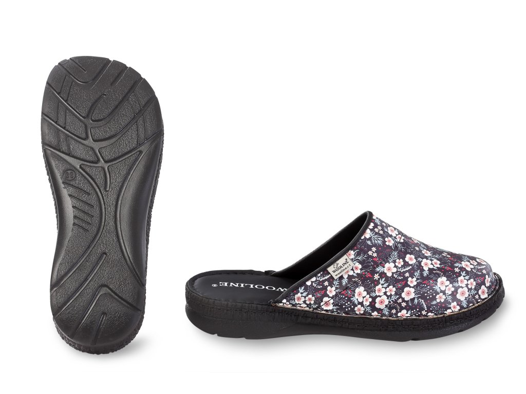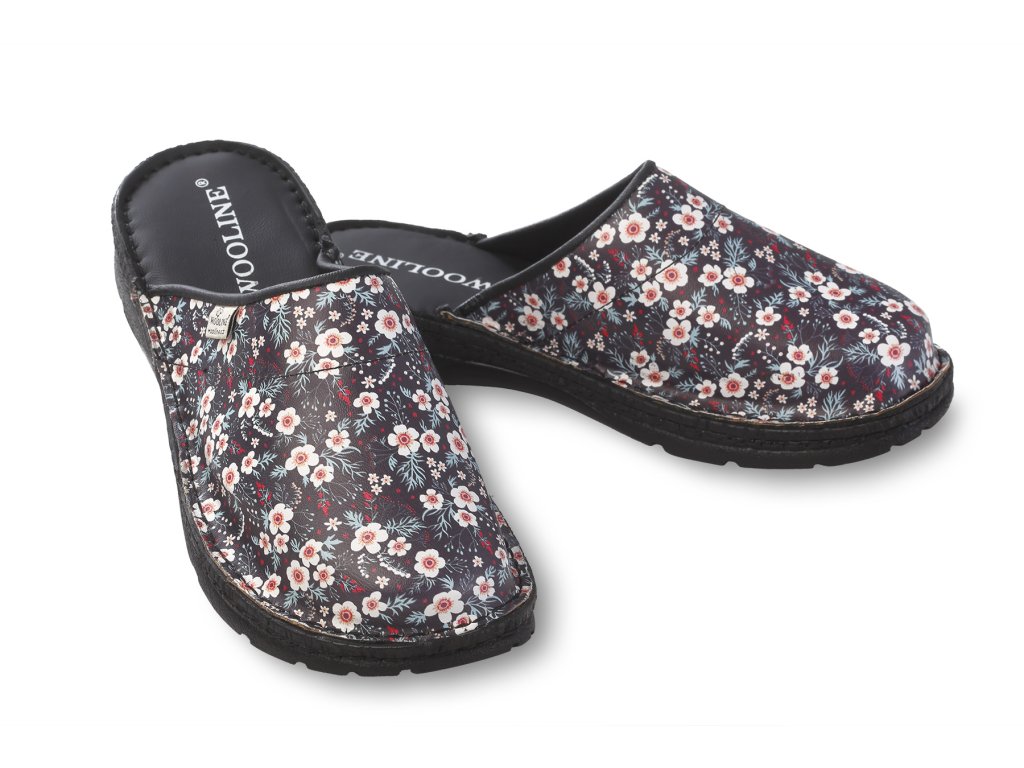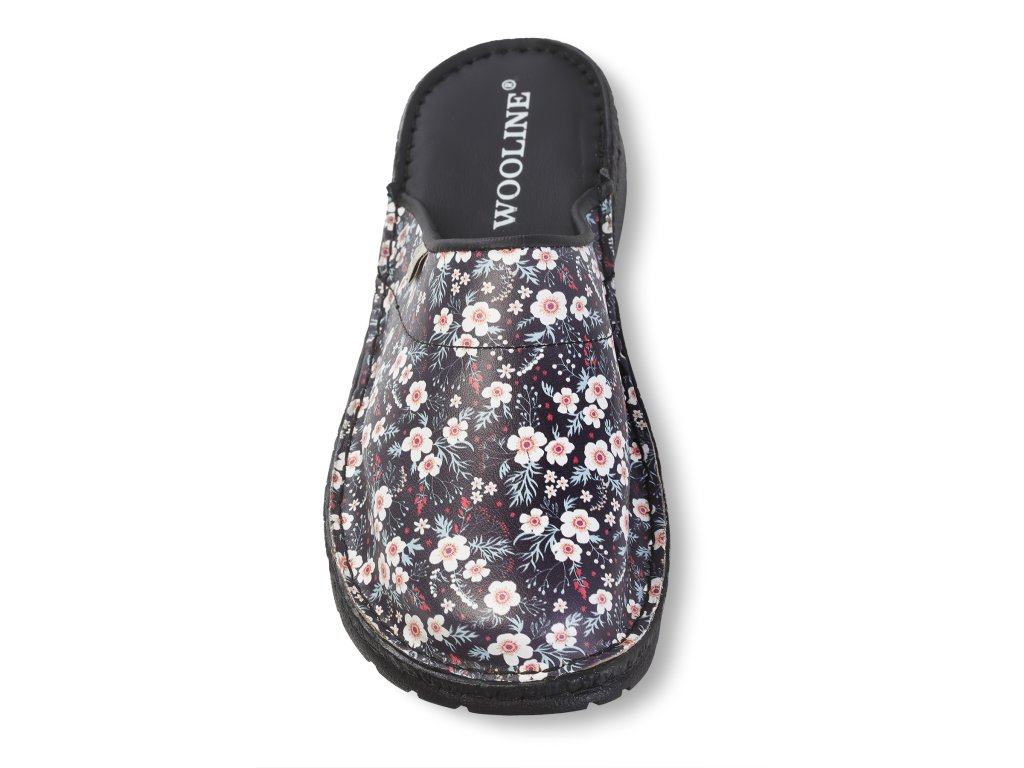 A fekete színű női bőr papucs színes virágmintával van díszítve és beltéri használatra készült. A bőr papucs kivételes kialakítású. A papucs belebújós és zárt orrú. A papucs gyártásához marhabőrt használtak, amely megtartja az alakját, és ennek köszönhetően a lábbeli nem deformálódik viselés közben.