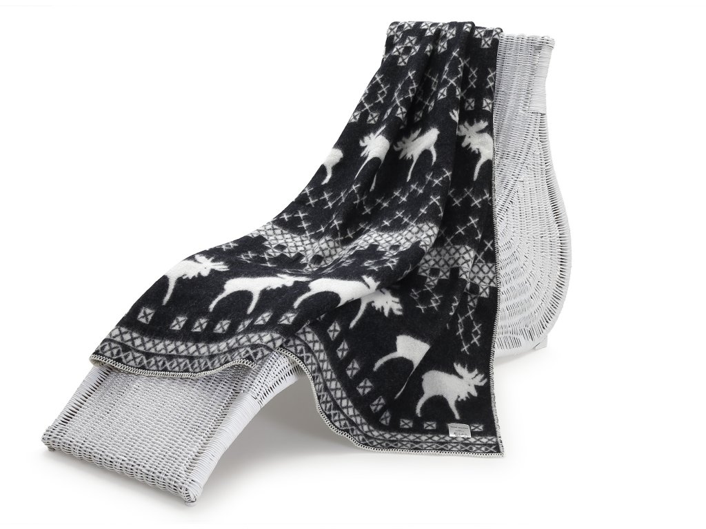 Fekete-fehér gyapjú pléd rénszarvas motívummal