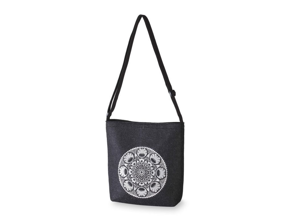 Szín: A táska teste sötét fekete nemezből készült. Az elülső oldalon fehér színű kör alakú dísz hímzett. A dísz átmérője 20 cm. A szíj fekete színben készült, a szíj műanyag pántokkal rendelkezik.