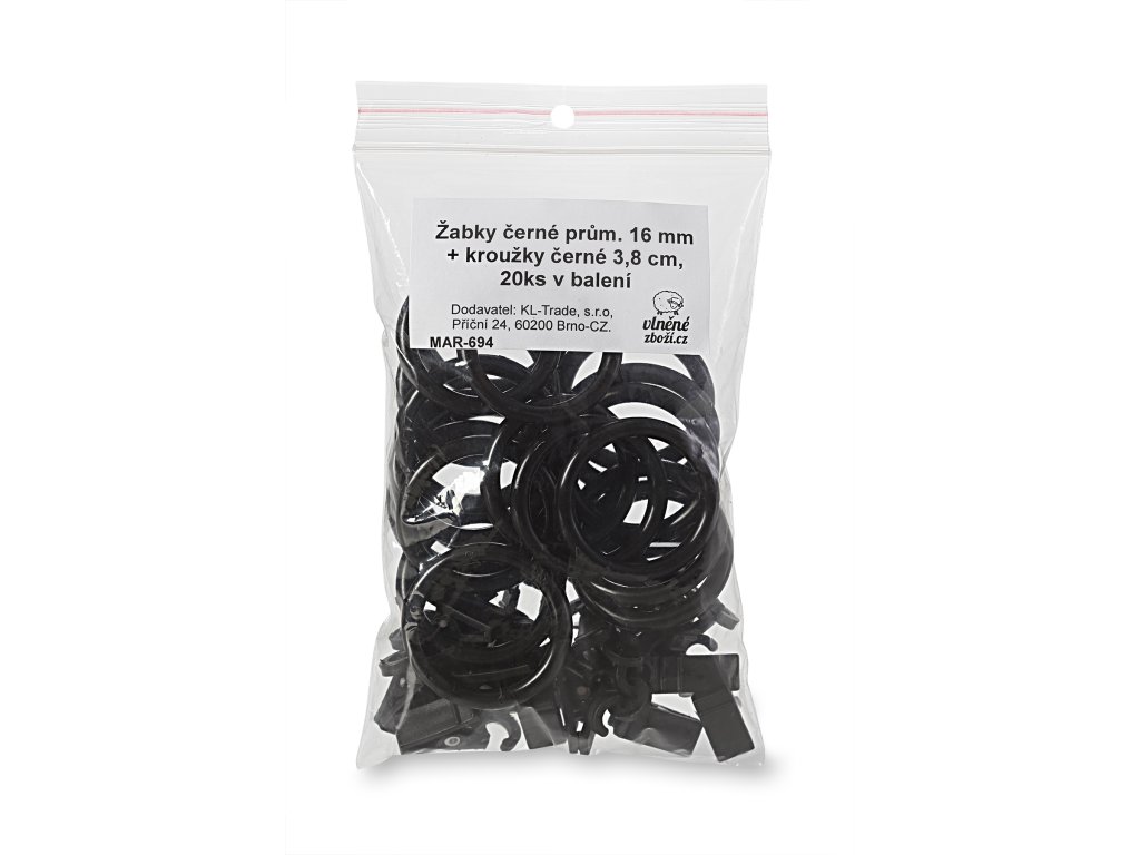 Műanyag szandál és műanyag gyűrűk készlete fekete színben. A karika 16 vagy 19 mm átmérőjű függönytartó rúdra való felhúzásra szolgál. A karikák rúdra való felhúzása után már csak a függönyt kell felakasztania a fém függönycsipeszekre.