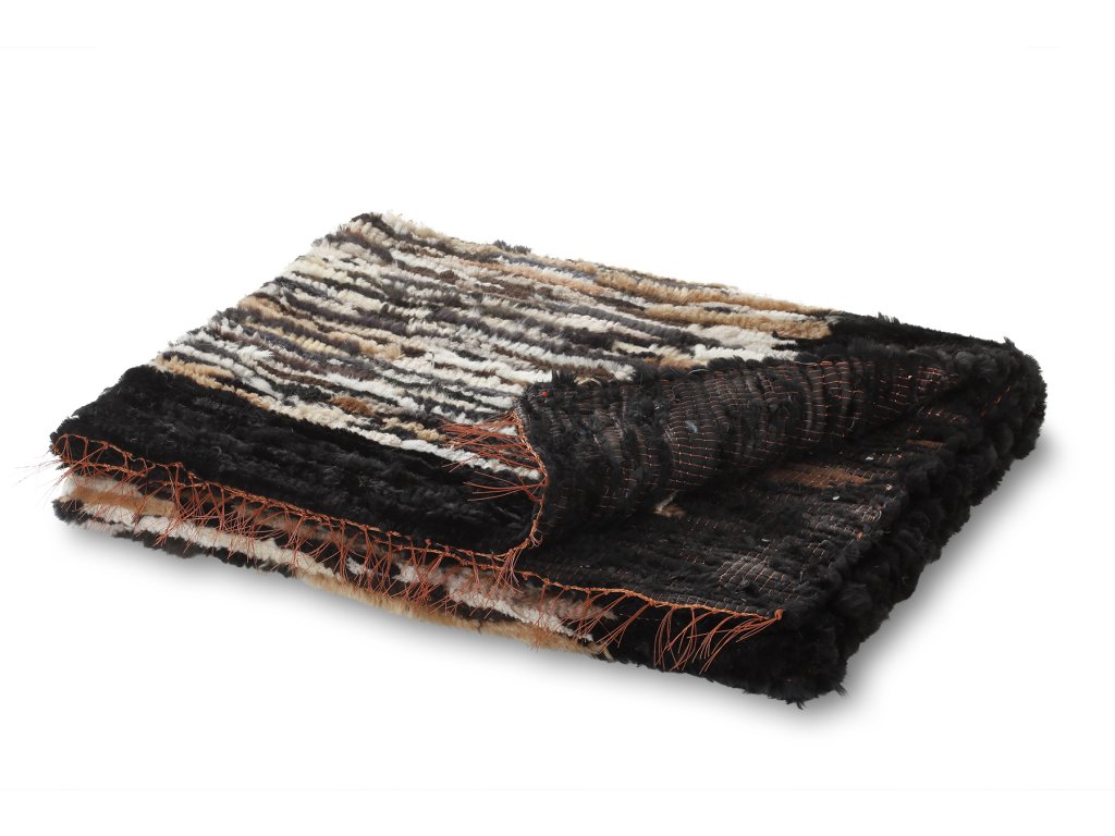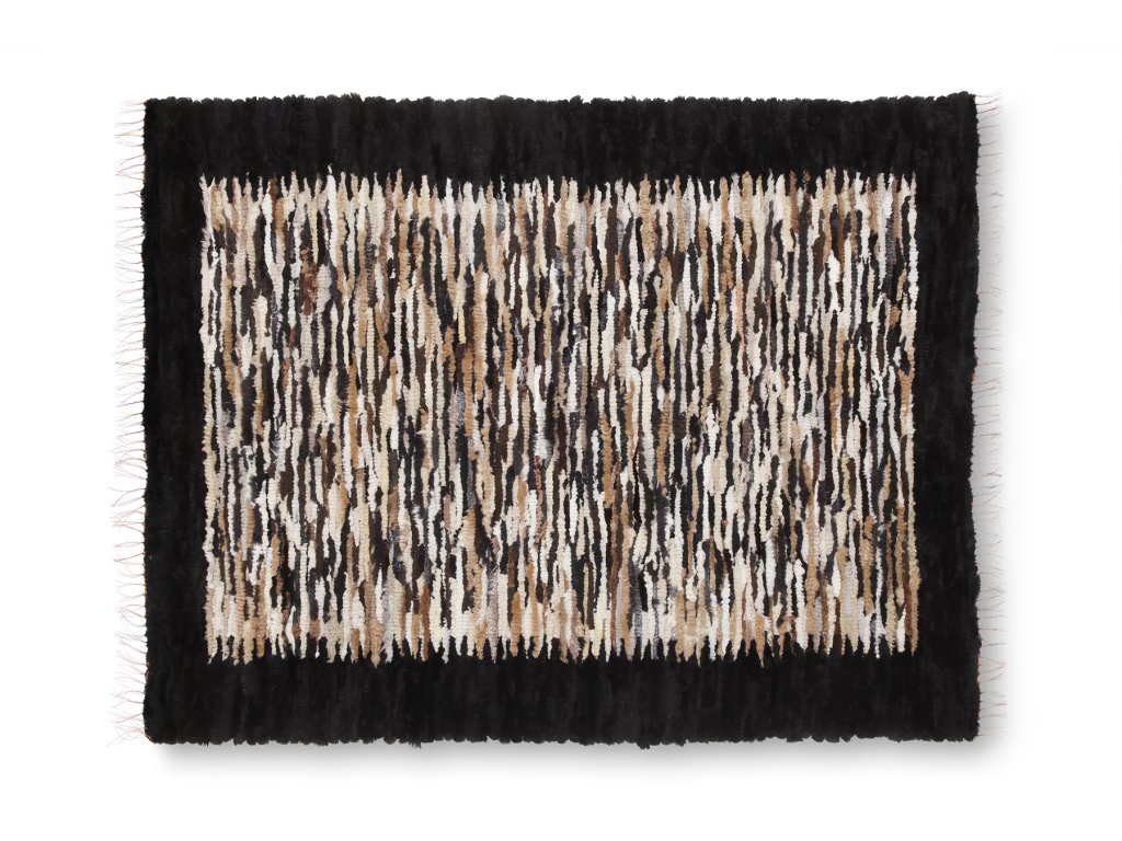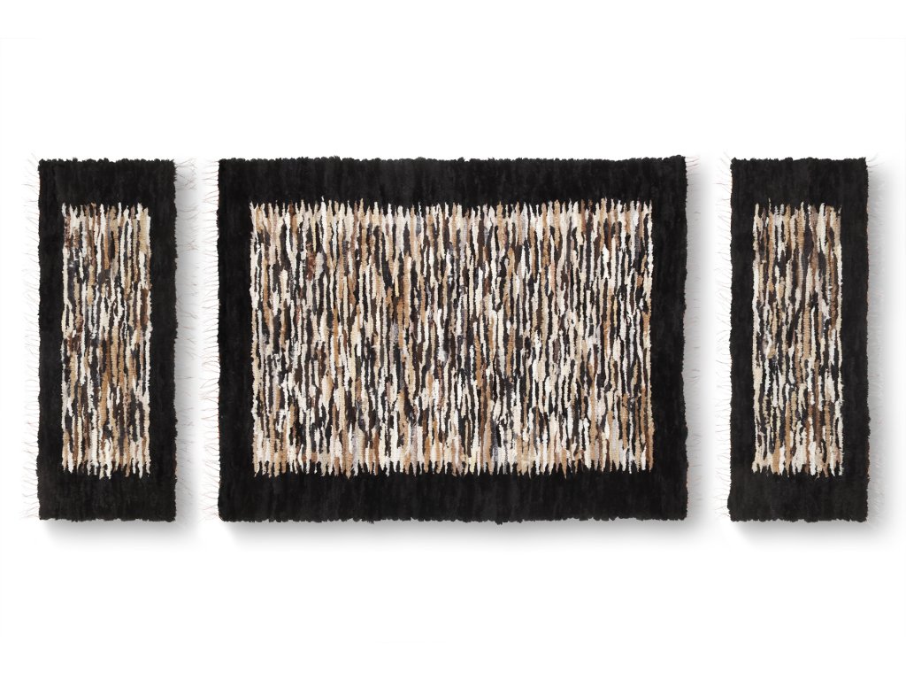 Természetes dekoratív szőtt szőnyegek, amelyek egy szettben érkeznek. Az eredeti és egyedi szőnyegekből álló szett összesen három darabból áll. A nagy szőnyeg mérete 160 x 200 cm, a kis szőnyegek mérete 60 x 160 cm. A szőnyegeket többféle színű bőrből szövik. A szőnyeg körös-körül sötétfekete. A szőnyegen világos krémszínű szőrcsíkok váltakoznak a barna több árnyalatának kombinációjából álló szőrcsíkokkal. A szőtt szőnyegek összhatása egyedi és különleges. Az alkalmazott szövési módszernek köszönhetően a szőnyeg hagyományos hangulatot kelt. A szőnyegben a sötét és a világos elemek váltakoznak. Így eredeti és különleges kiegészítője lesz bármely belső térnek. A kivitelezés nagyon precíz, és minden egyes darab egy eredeti, amely gyönyörűen fest majd bárhol a nappaliban, egy tágas előszobában vagy a hálószobában is.