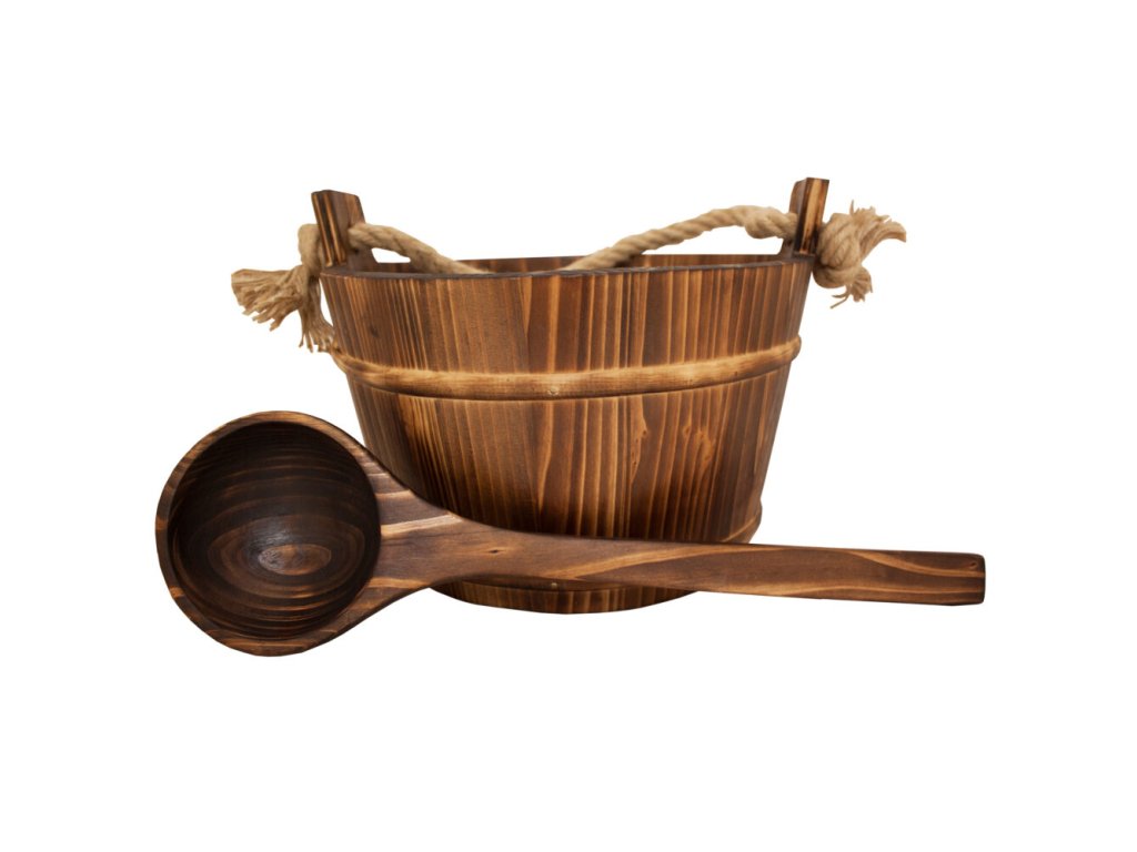A vödör és betét szett tartalmaz egy stílusos, fából készült szaunakanalat.