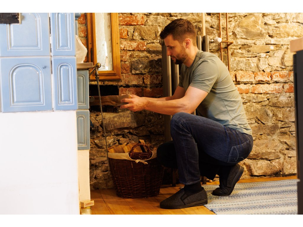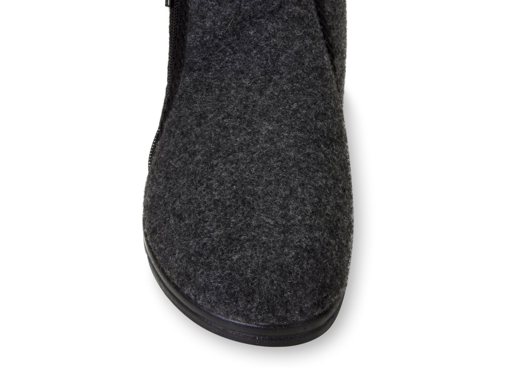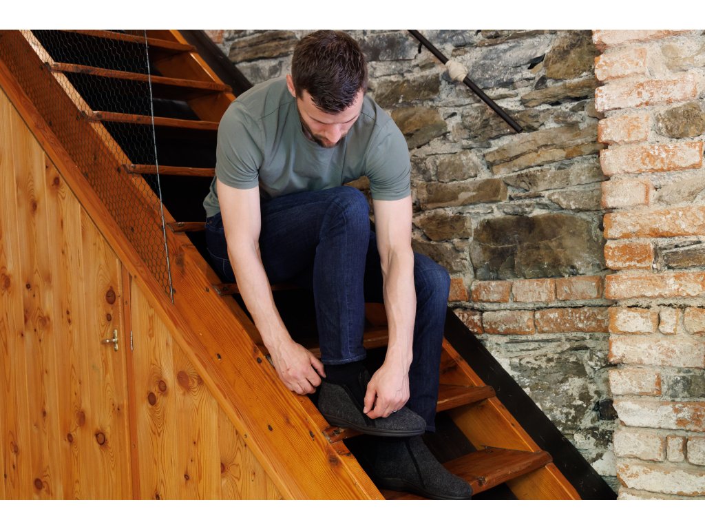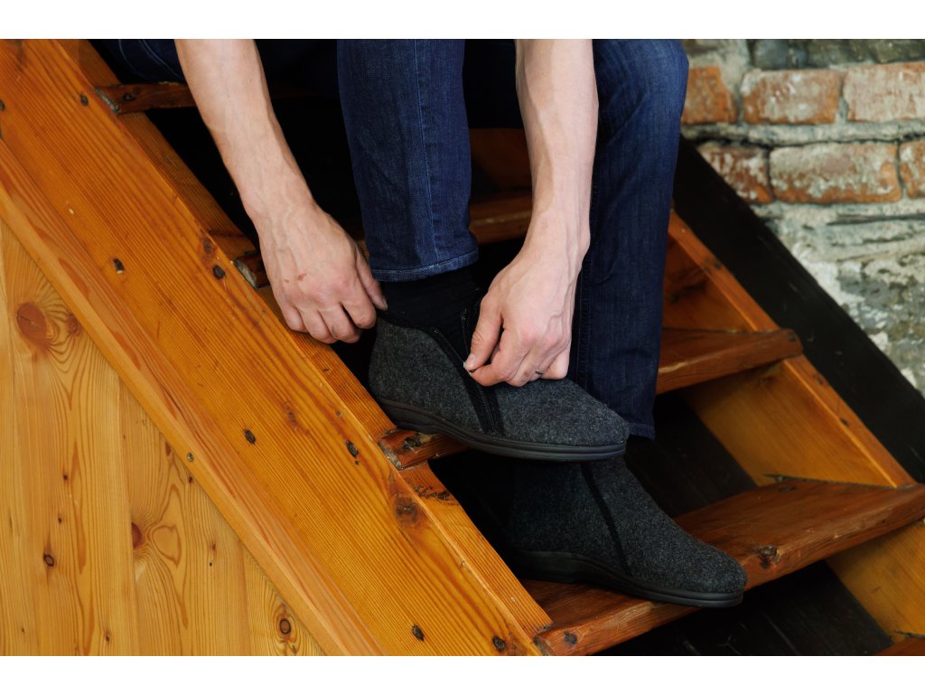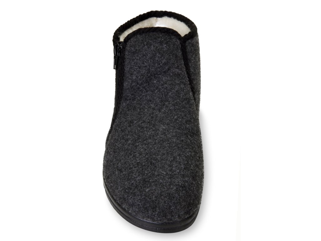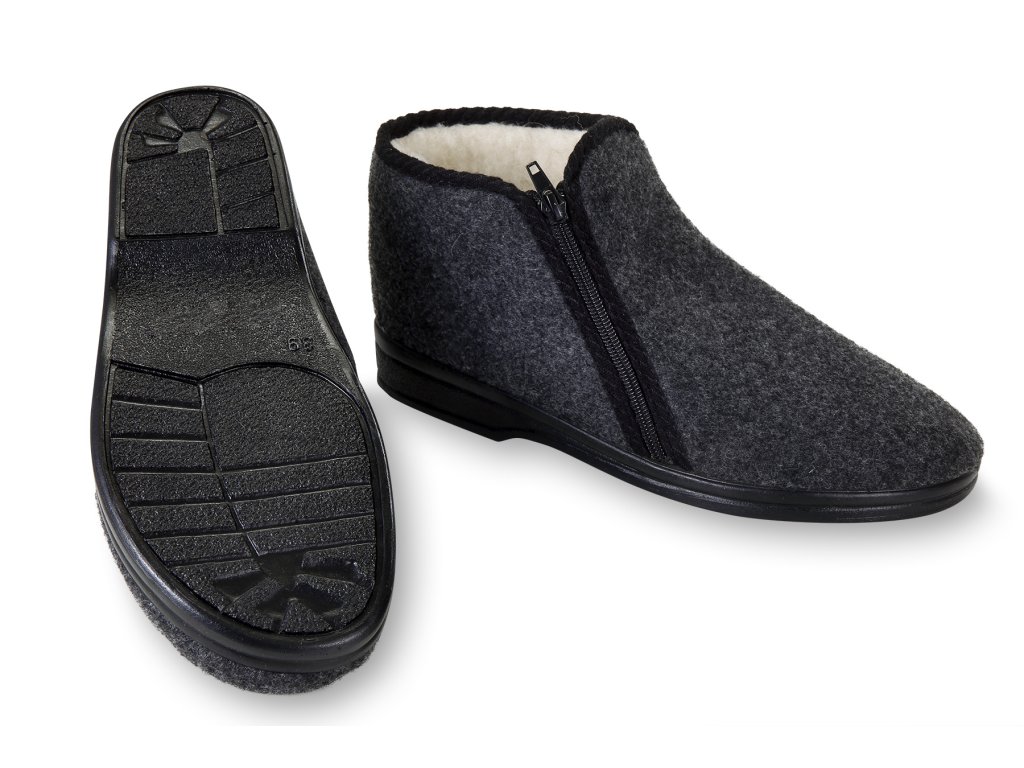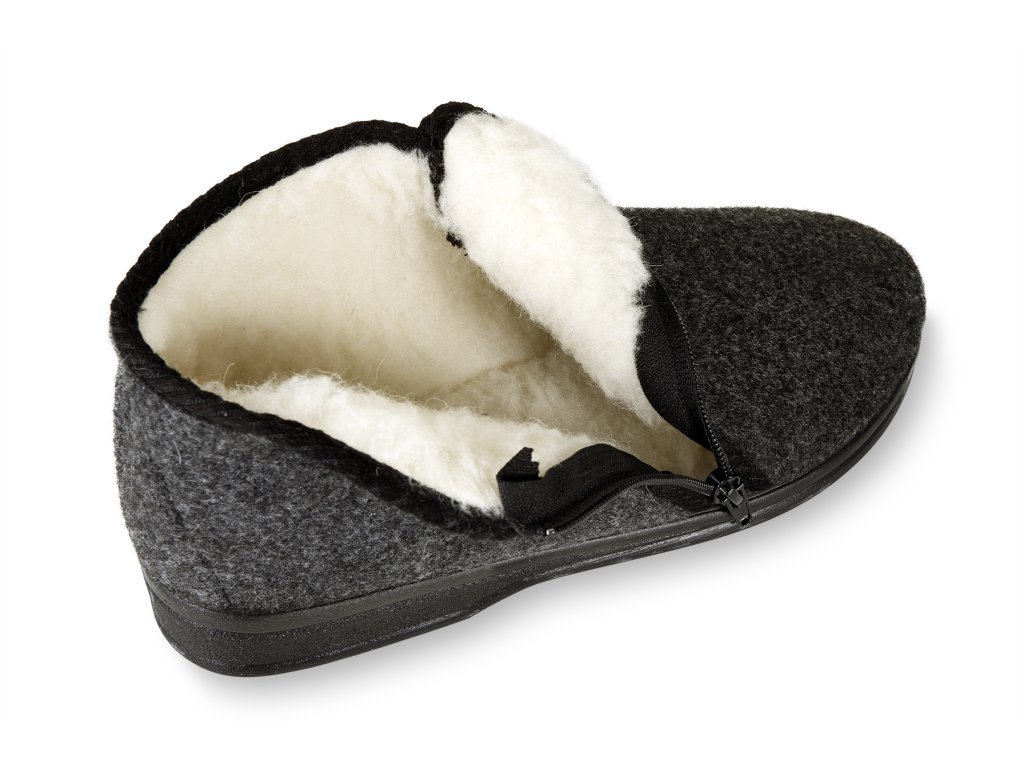 Nagyon könnyű és meleg, alacsony férfi mamuszok természetes sötétszürke-fekete színben. Ez a cipő teljes egészében természetes birkagyapjúval van töltve, az oldalán cipzárral záródik. Nagy előnye, hogy nagyon széles nyílással rendelkezik a lábfej számára, ami megkönnyíti a felhúzást. Párnázott minden átlagos lábmagassághoz és -szélességhez. Az alja könnyű és rugalmas PU anyagból készült.