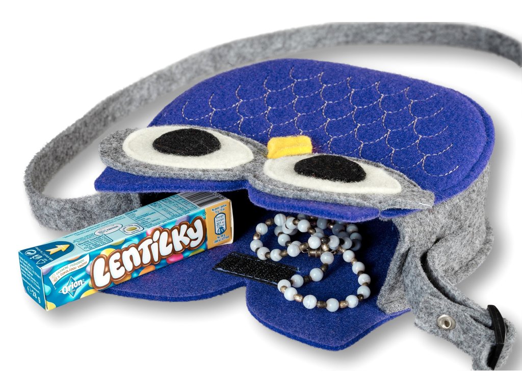 A legkisebbeknek szánt filc táska egy kis kíváncsi bagoly formájában érkezik. Sötétkék filcből készült kézitáska bagollyal, tetején tépőzáras rögzítéssel.