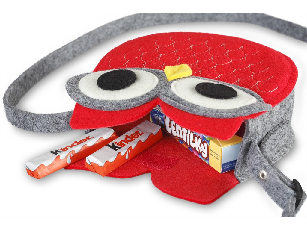 A legkisebbeknek szánt filc táska egy kis kíváncsi bagoly formájában érkezik. Piros filcből készült kézitáska bagollyal, tetején tépőzáras rögzítéssel.