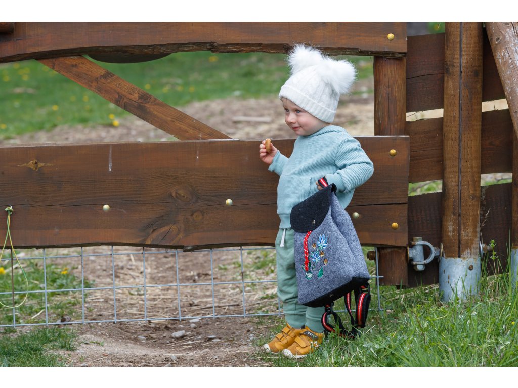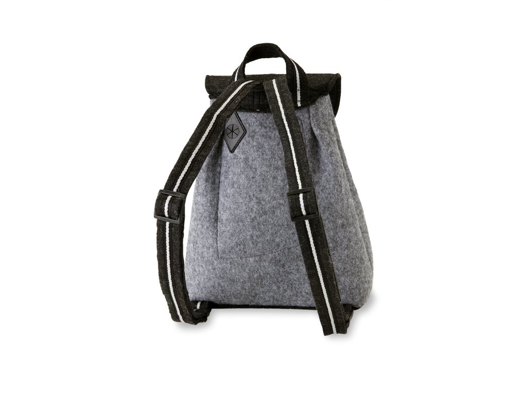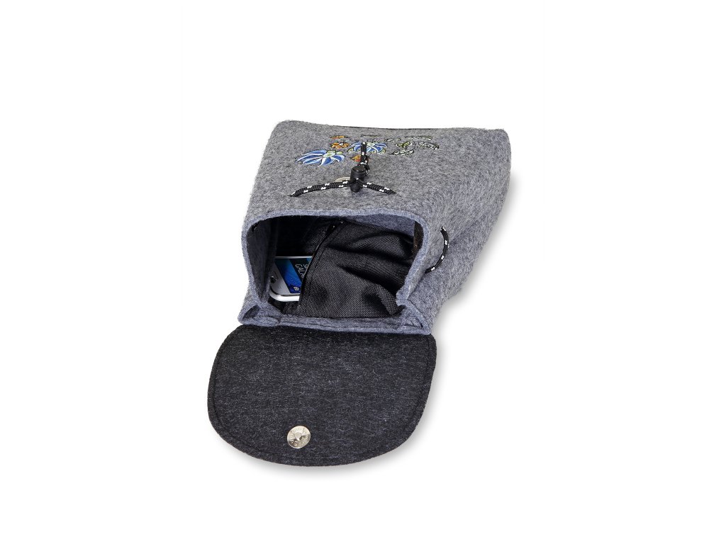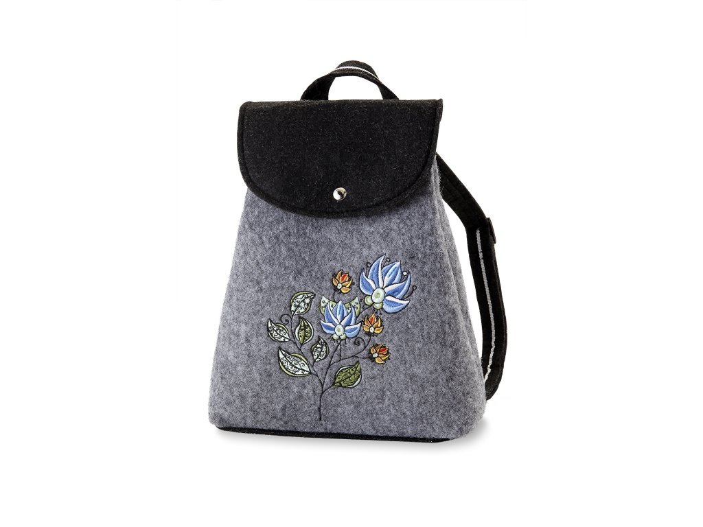 A stílusos és egyedi hátizsák 100% nemezből készült. A nemezből készült hátizsák teste világosszürke színű. A külső oldalon egy mélykék virág hímzése látható, jellegzetes zöld szárral. A hátizsákot pantentzárral lehet becsatolni. A hátizsák belső része összehúzható a hátizsák tetején lévő, bevarrt húzózsinórral. A hátizsák két pánttal van felszerelve, amelyek opcionálisan állíthatóak. A pántok fekete színűek alapesetben.